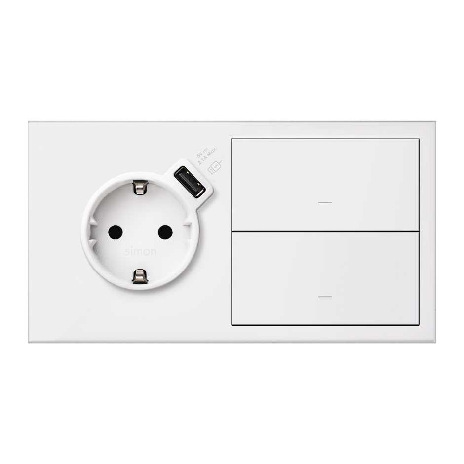 Simon 100 Кит 2 поста механизм 1 розетка Schuko с з/у USB SC 2.1А + 2 переключателя (проходные) + суппорт от производителя Simon. Артикул производителя 10010212-039.