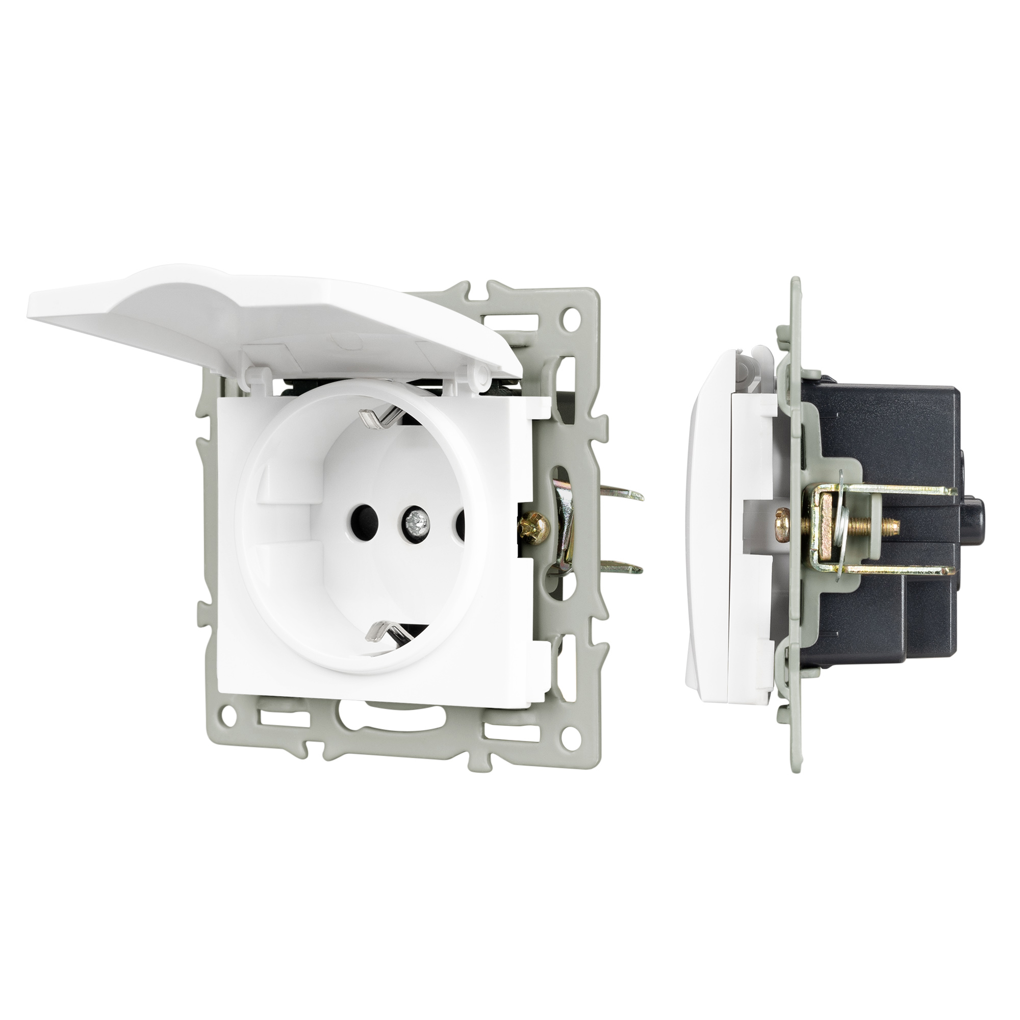 Механизм розетки с заземлением на 1 пост с влагозащитной крышкой, с суппортом из алюминия. Цвет - белый. Степень пылевлагозащиты - IP44.
