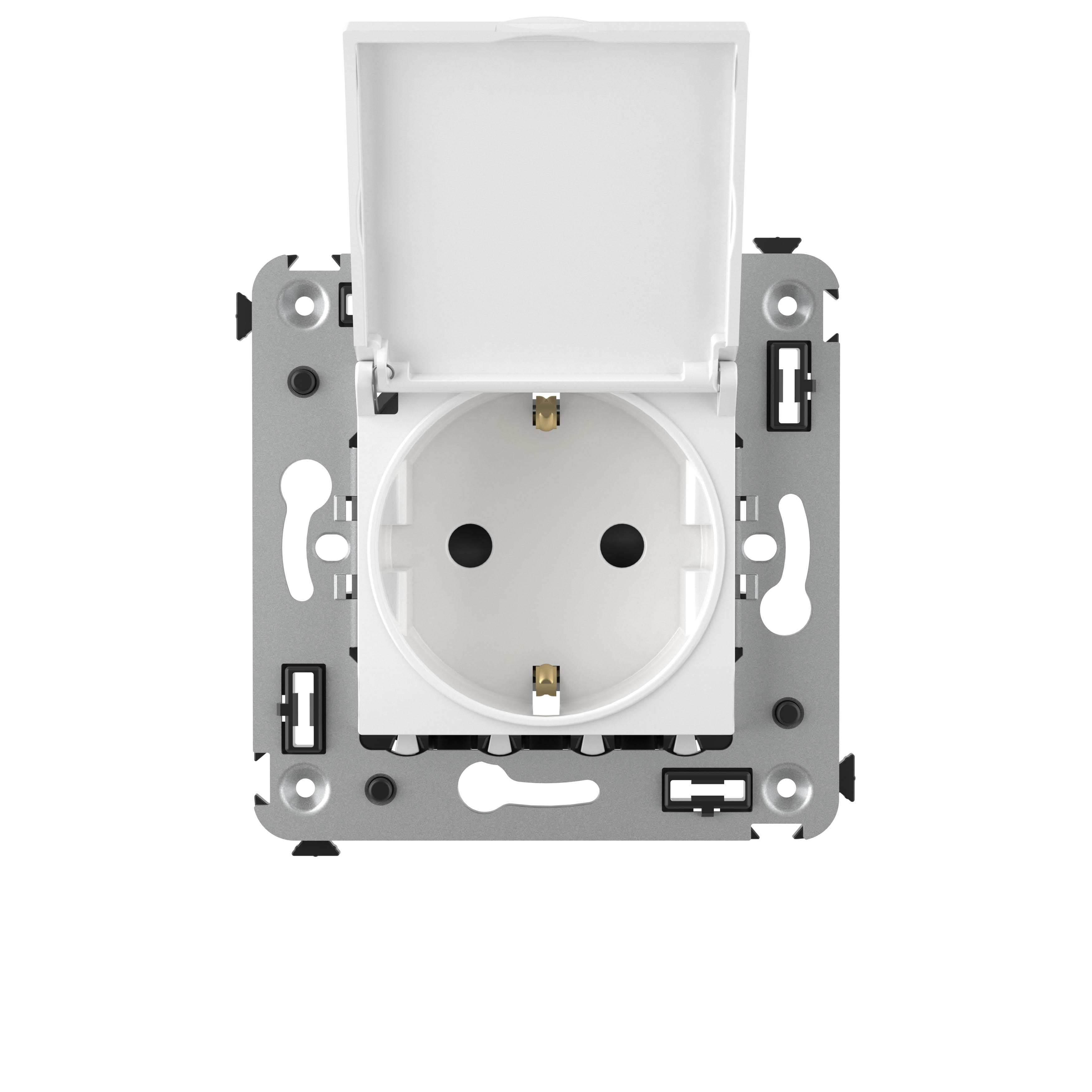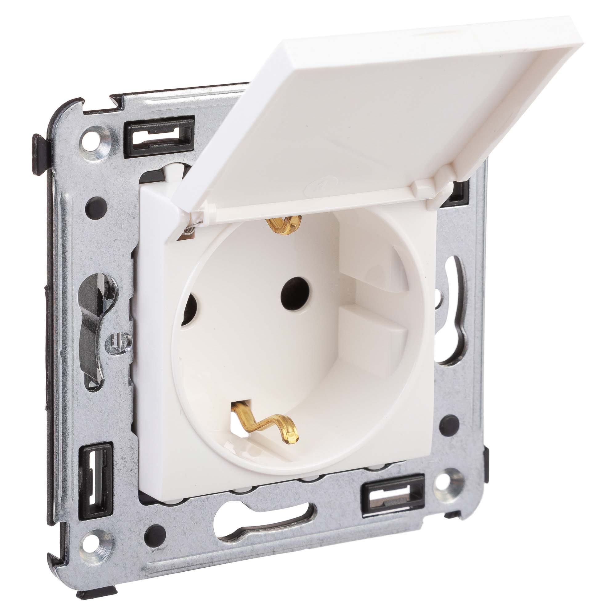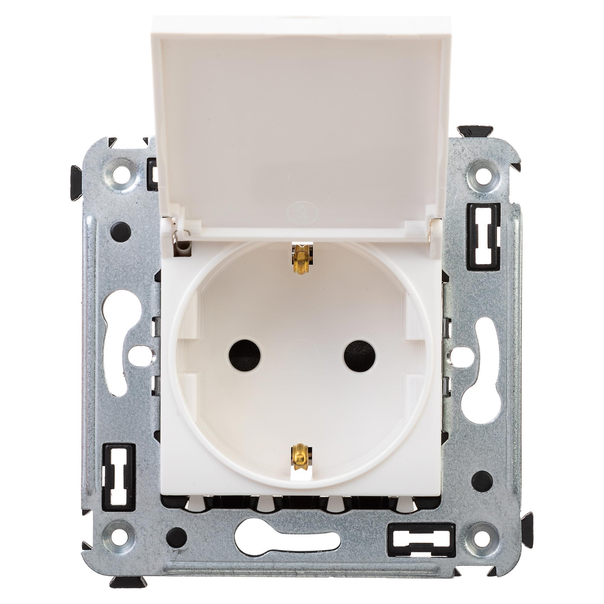 Розетка 2P+E с крышкой – это однофазная розетка с заземлением. Изделие предназначено для скрытого монтажа в стену и может применяться как в жилых, так и в коммерческих или производственных помещениях. Крышка защищает механизм от загрязнения и попадания влаги в то время, когда розетка не используется. Номинальное напряжение – 230 В, номинальный ток – 16 А. Материал: металл, термопласт. Пластиковые элементы устройства имеют благородный белый оттенок "Белое облако", который ненавязчиво вписывается в интерьер любой цветовой гаммы и прекрасно сочетается с любыми оттенками.