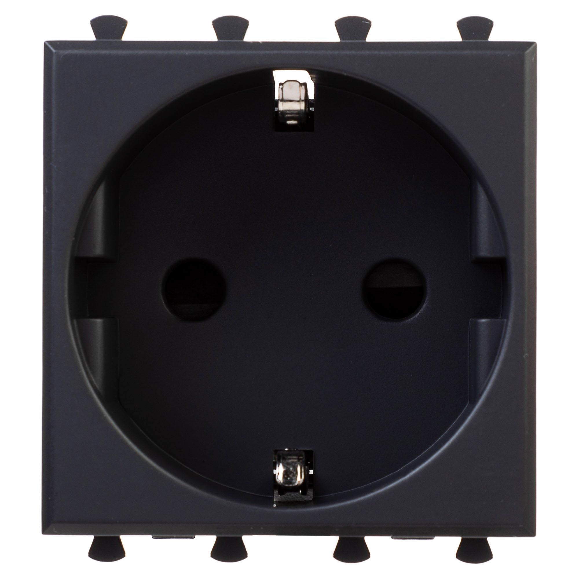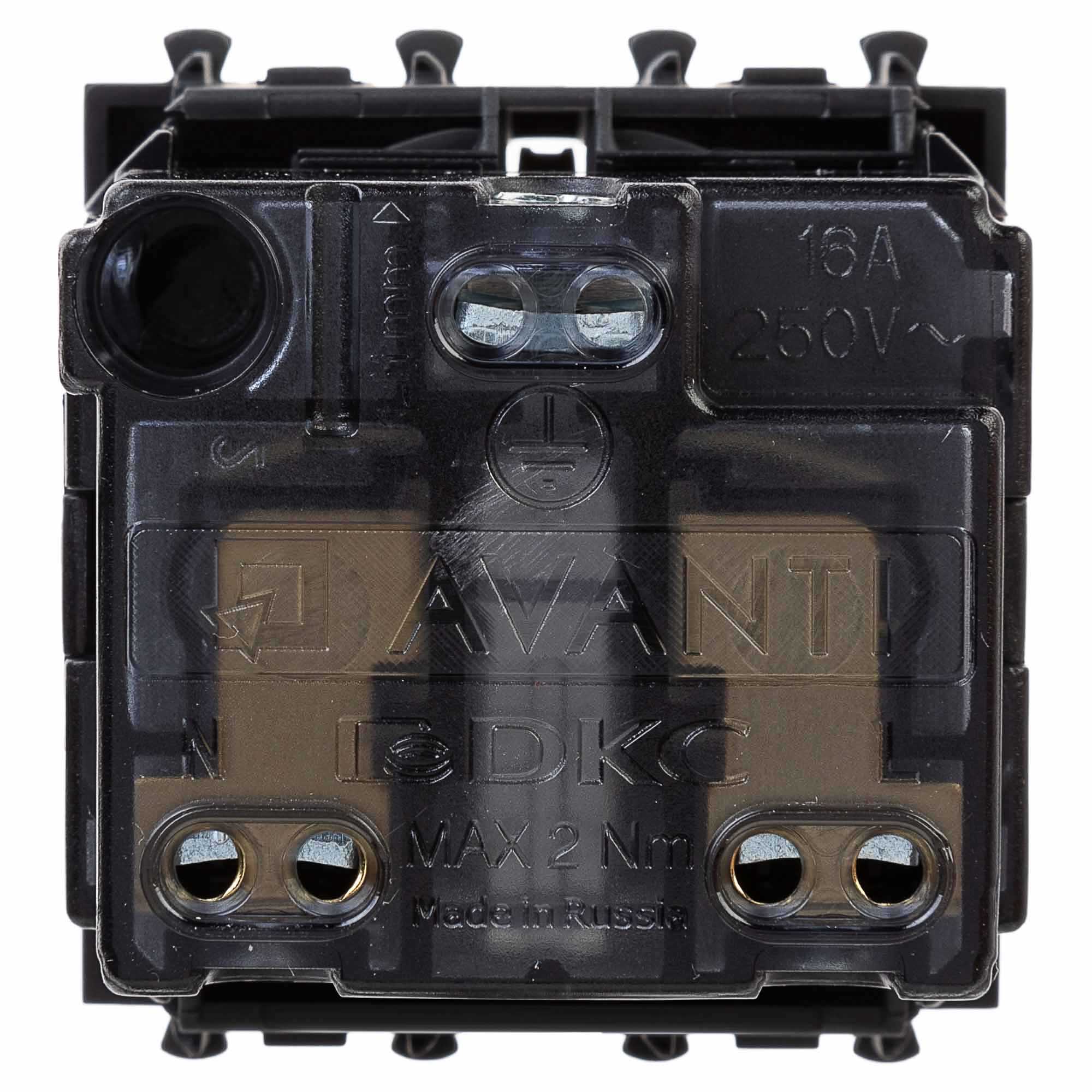 Розетка электрическая с заземлением, со шторками и возможностью установки подсветки, модульная. Предназначена для монтажа в системы "In-liner Front" и "In-liner Aero" при помощи рамок-суппортов и каркасов "Avanti" (код 4400912 и т.д.) Используется для подключения оргтехники, бытовых приборов и т.д. Характеристики: диаметр отверстий для ввода кабелей – 3 мм (по 2 отверстия на одну клемму); винтовые зажимы; защитные шторки; шаблон для зачистки кабеля – 11 мм; номинальный ток – 16 A; номинальное напряжение – 230 В. Фиксация производится в подрозеточные коробки глубиной не менее 45 мм при помощи каркаса с лапками (код 4400802) и саморезов. 2 модуля. Цвет: "Черный квадрат".