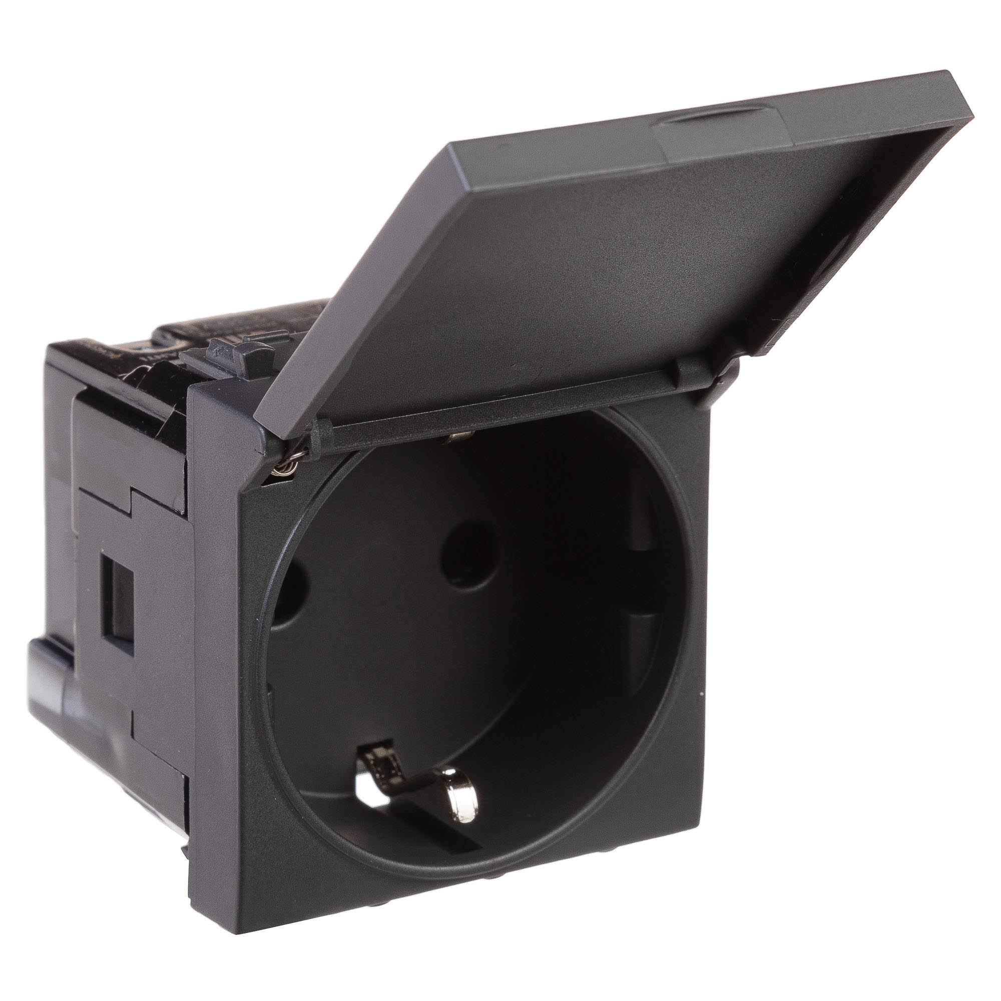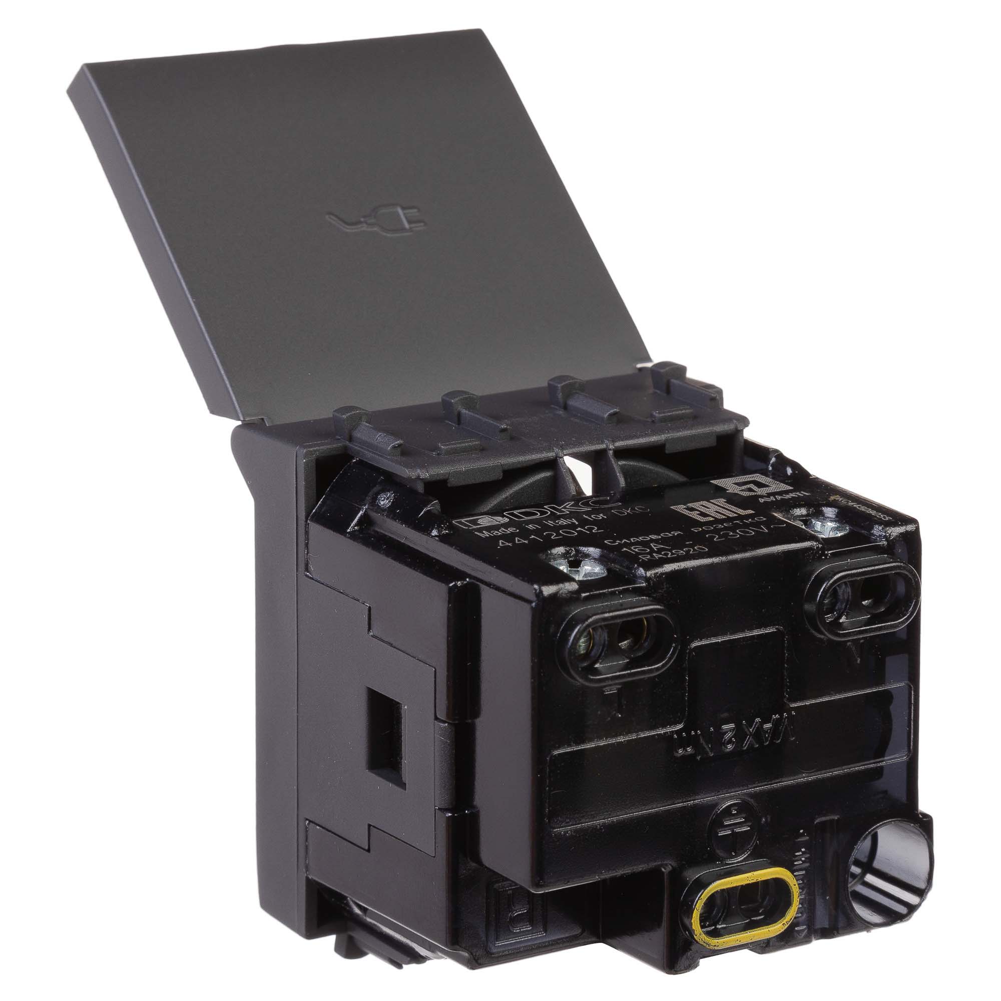 Розетка 2P+E (однофазная розетка с заземлением) модульная с крышкой от ДКС применяется для подключения различных электроприборов. Изделие предназначено для монтажа в системы "In-liner Front" и "In-liner Aero" при помощи рамок-суппортов и каркасов "Avanti" (код 4400912 и т.д.). Лаконичные формы электроустановочных изделий "Avanti" отлично сочетаются с глубокими цветами. Пластиковые части устройства имеют оттенок "Черный матовый". Это темный насыщенный цвет, который легко сочетается с любыми оттенками, придавая им оттенок богемной утонченности.