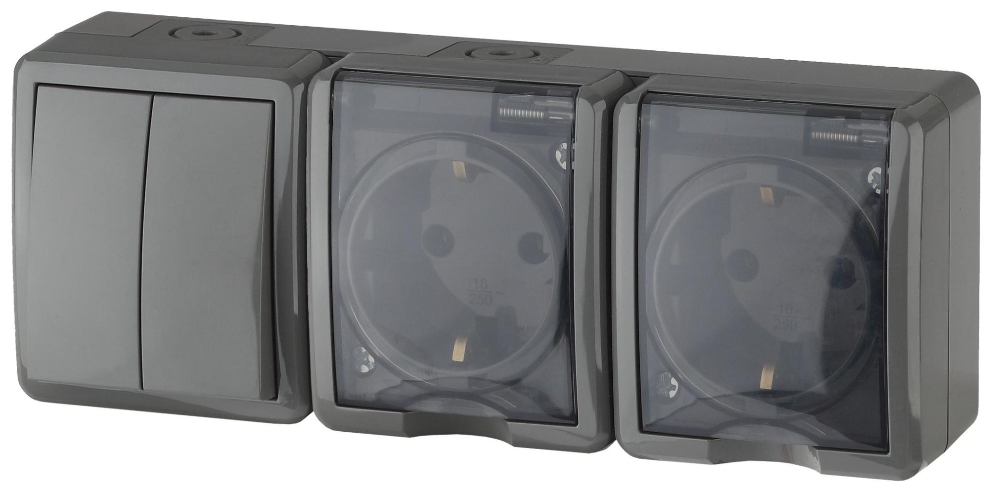 Блок две розетки с двойным выключателем IP54 Эра Эксперт открытой установки серый 11-7404-03. Номинальные характеристики 16А(10AX) 250В . Устройство выполнено из качественного поликарбоната, оснащёно уникальными винтовыми клеммами ЭКСПЕРТ для максимально качественного зажима кабеля в механизме.