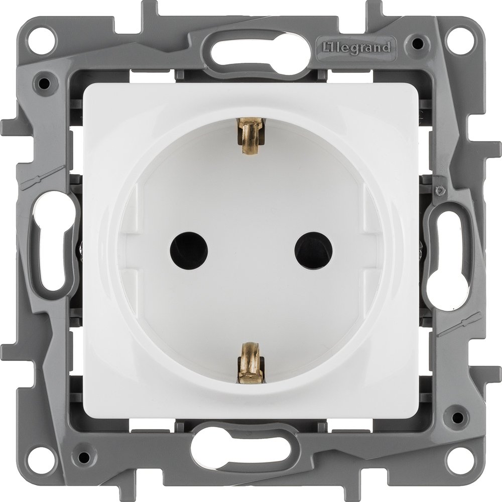 Розетка с заземлением и защитными шторками Legrand Etika для скрытого монтажа, цвет белый. Максимальный ток 16 А, максимальная мощность 3680 Вт. Применяется в зданиях, оборудованных для повышения безопасности проводкой с заземлением (с защитным проводником). Рекомендуются к применению в квартирах и помещениях с детьми. Шторки осуществляют защитную функцию путём ограничения доступа к токоведущим контактам. Доступ открывается только при подключении вилки.