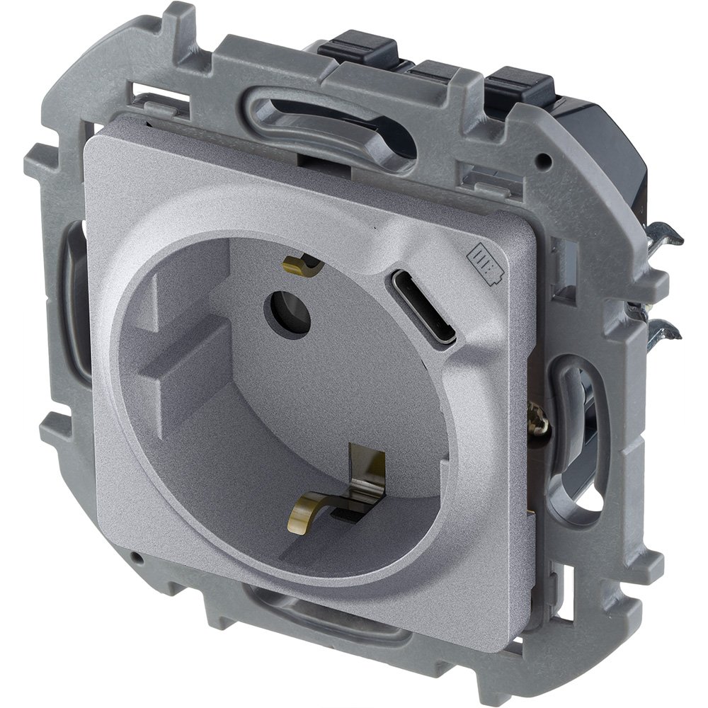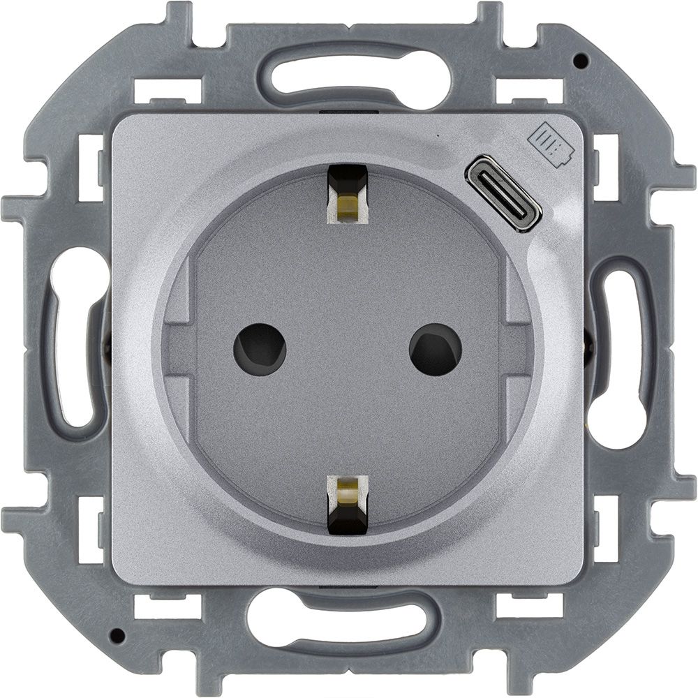 Комбинированная розетка 2К+З с зарядным устройством USB тип С Legrand Inspiria для скрытого монтажа, цвет "Алюминий". Максимальный ток розетки 16АХ, напряжение розетки ~250В, напряжение зарядного устройства =5В, максимальный зарядный ток 1500 мА. Применяется для одновременного электропитания бытовых потребителей и зарядки мобильного устройства. Оснащена интегрированными шторками, которые защищают детей и других пользователей от удара электрическим током. Особенности изделия: - Устройство размещается в 1 установочное место и подходит для многопостового монтажа без ограничений. - Возможно одновременное подключение двух устройств для элекропитания и зарядки. - Стандартный ток розетки 16 АХ позволяет осуществлять электропитание любых бытовых электроприборов без ограничений. - Защитные шторки интегрированы в механизм, обеспечивают высокий уровень электробезопасности и не затрудняют подключение и извлечение вилки. - Зарядный модуль интегрирован в схемотехнику, не требуя дополнительных подключений и соединений при у