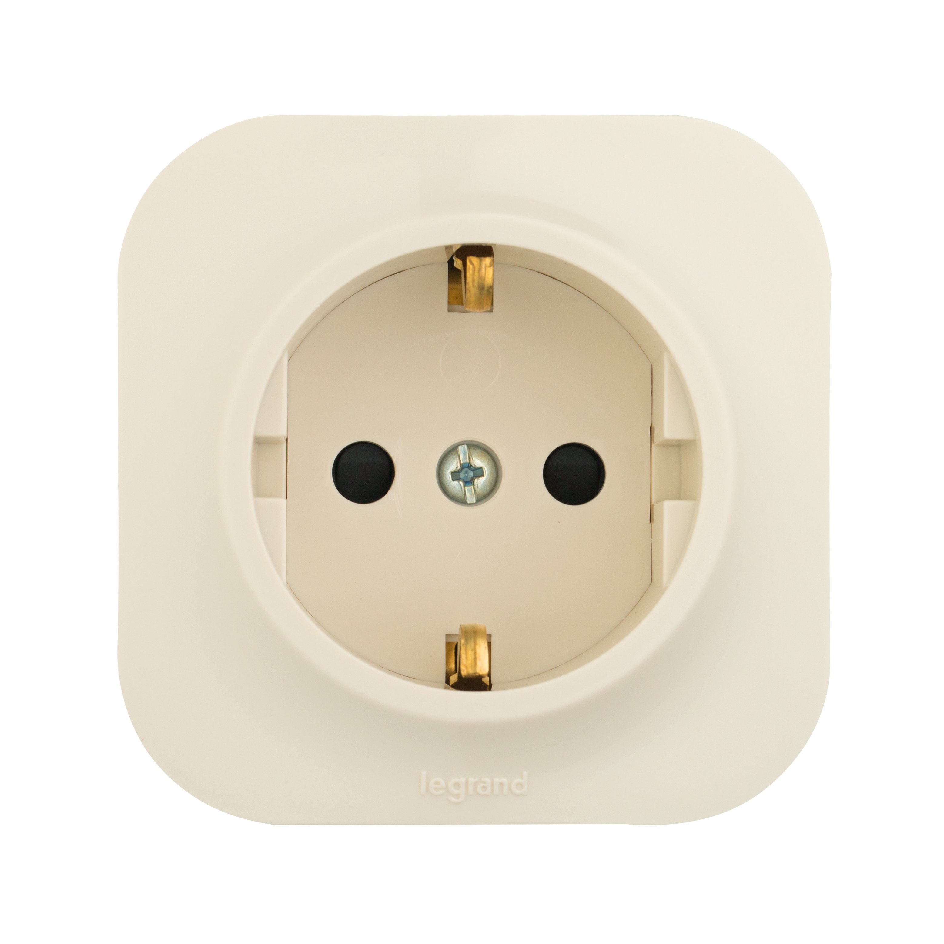 Розетка с заземлением и защитными шторками Legrand Quteo для открытого монтажа, цвет слоновая кость. Максимальный ток 16 А, максимальная мощность 3680 Вт. Применяется в зданиях, оборудованных для повышения безопасности проводкой с заземлением (с защитным проводником). Рекомендуются к применению в помещениях в которых могут быть дети. Шторки осуществляют защитную функцию путём ограничения доступа к токоведущим контактам. Доступ открывается только при подключении вилки.