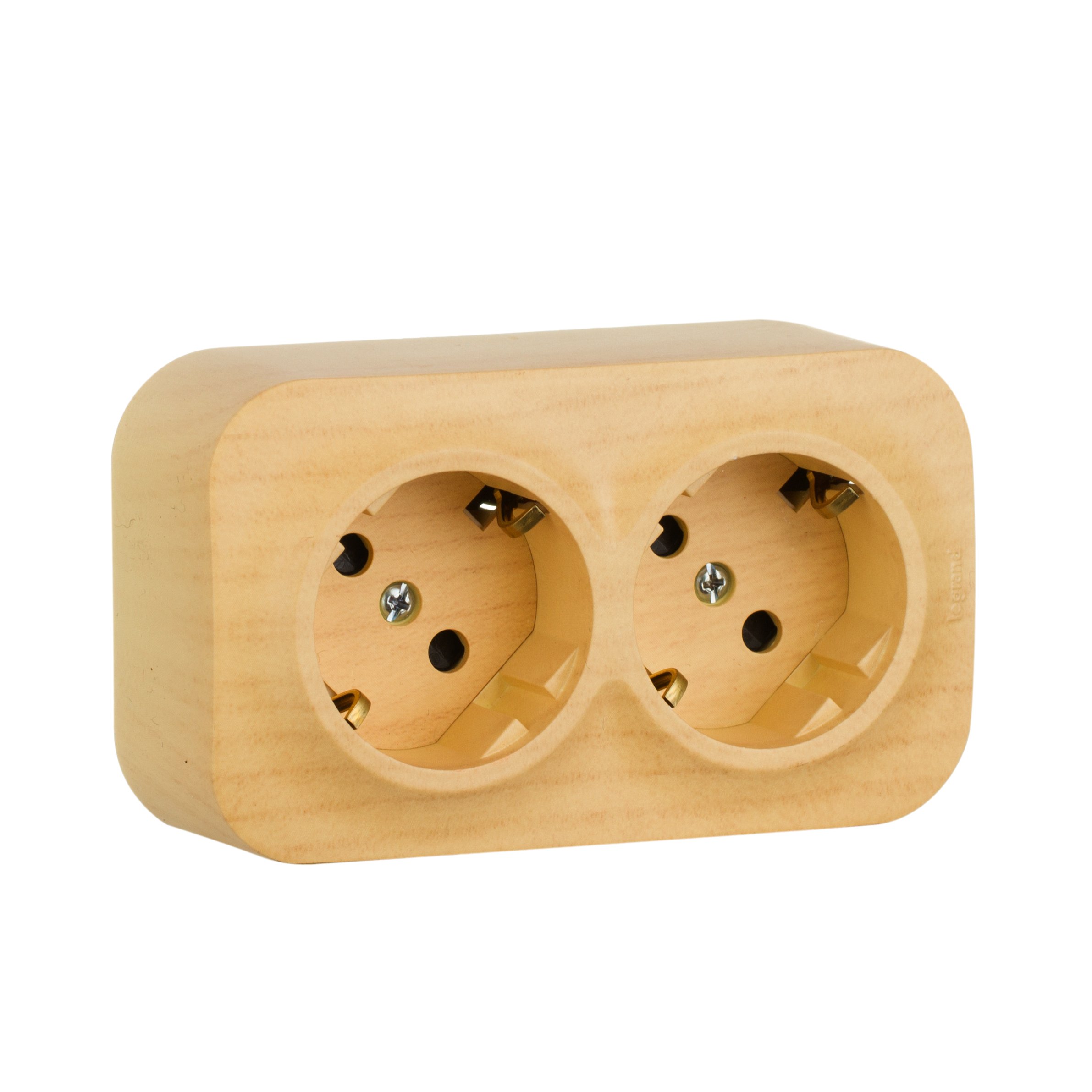 Двойная розетка с заземлением, со шторками Legrand Quteo, цвет дерево, для открытого монтажа. Максимальный ток 16 А, максимальная мощность 3680 Вт. Применяется в зданиях, оборудованных для повышения безопасности проводкой с заземлением (с защитным проводником). Рекомендуются к применению в помещениях в которых могут быть дети. Шторки осуществляют защитную функцию путём ограничения доступа к токоведущим контактам. Доступ открывается только при подключении вилки.