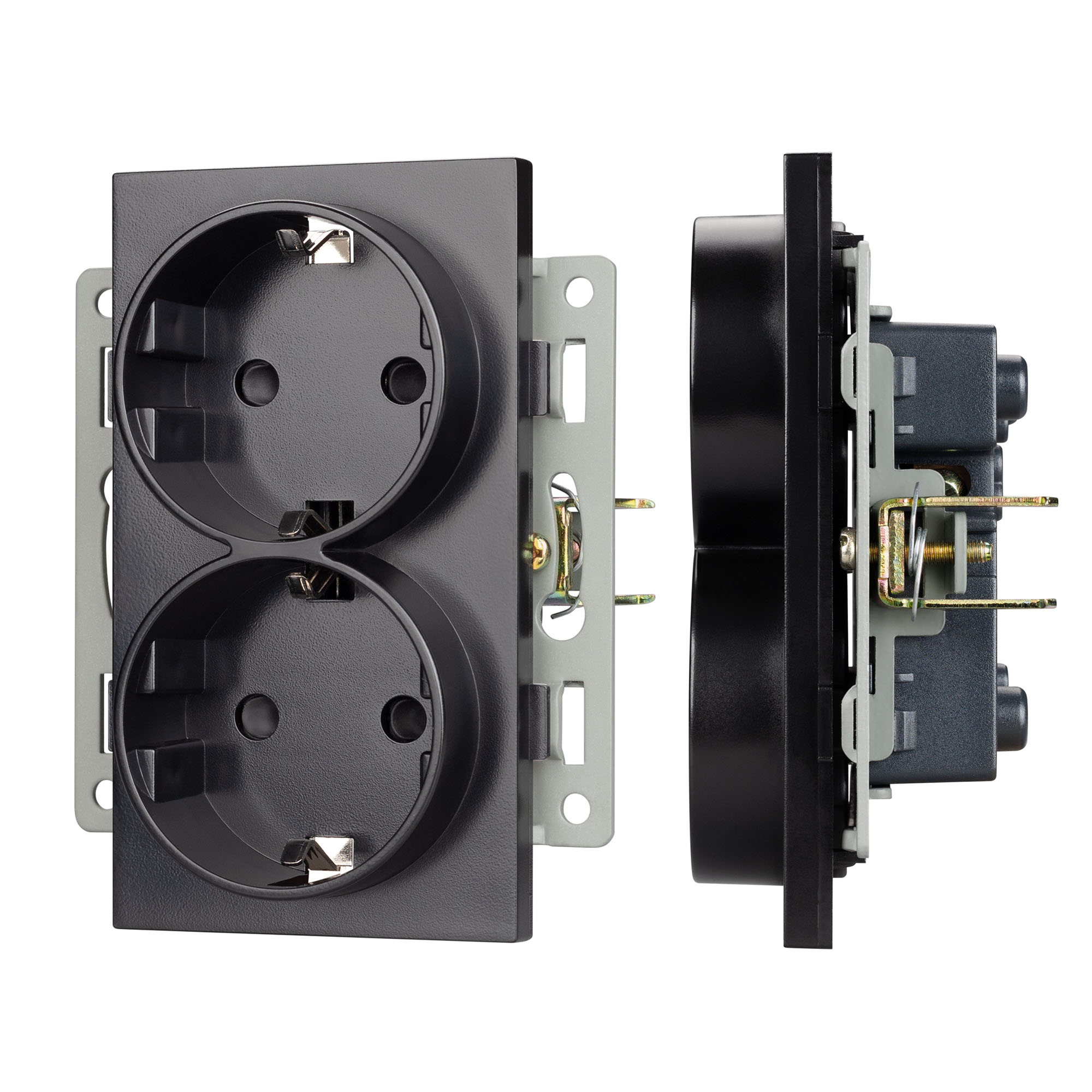 Механизм розетки вертикальный, с заземлением на 2 поста и с суппортом из алюминия. Цвет - черный. Степень пылевлагозащиты - IP20.