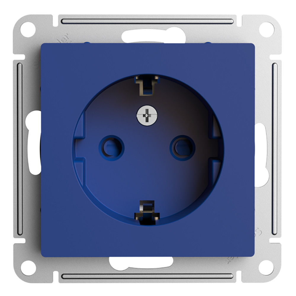 Механизм Systeme Electric (ранее Schneider Electric) серии AtlasDesign в цвете аквамарин розетки одинарной с заземлением и шторками подходит для сетей 250 В, на ток 16 А.