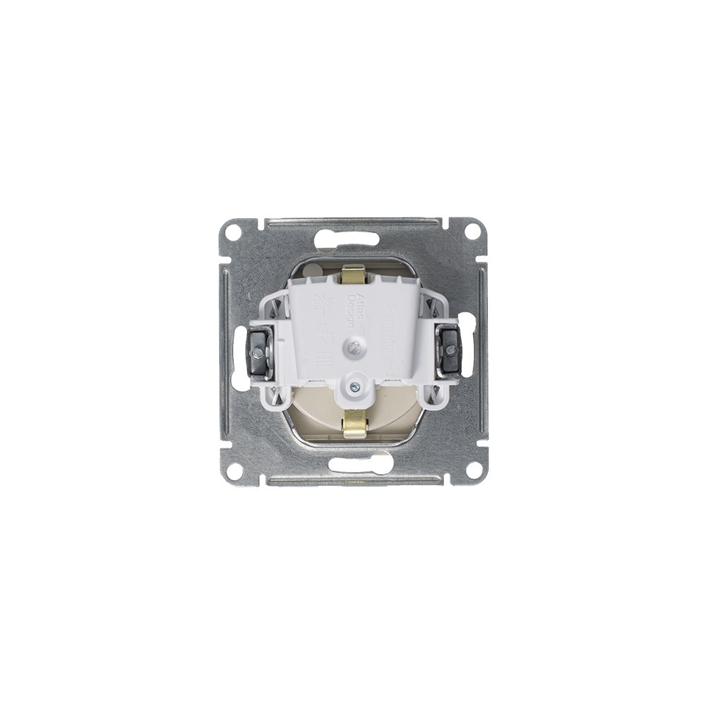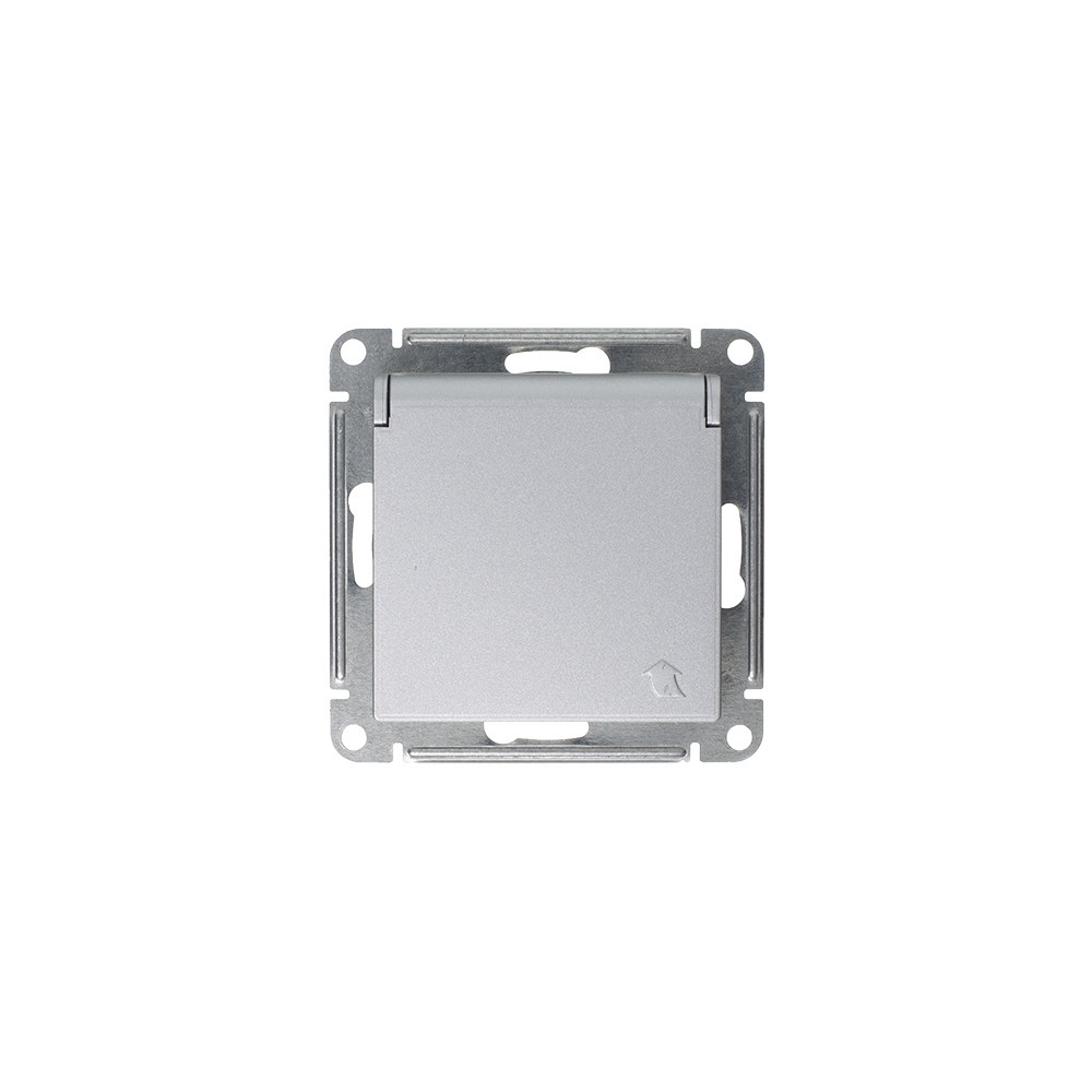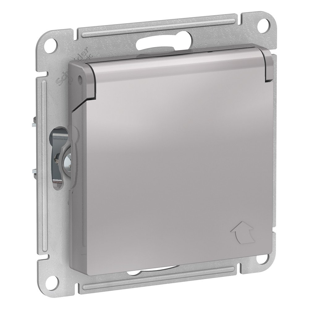 Механизм Systeme Electric (ранее Schneider Electric) серии AtlasDesign в цвете алюминий розетки одинарной с заземлением, шторками и крышкой подходит для сетей 250 В, на ток 16 А.