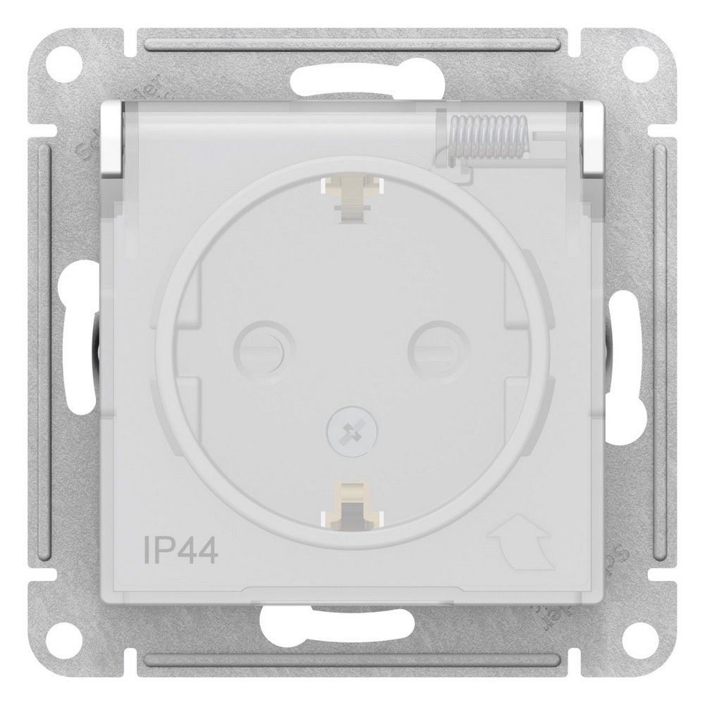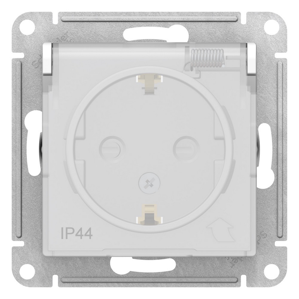 Механизм Systeme Electric (ранее Schneider Electric) серии AtlasDesign Aqua (цвет белый) розетки одинарной с заземлением, шторками и крышкой подходит для сетей 250 В, на ток 16 А.