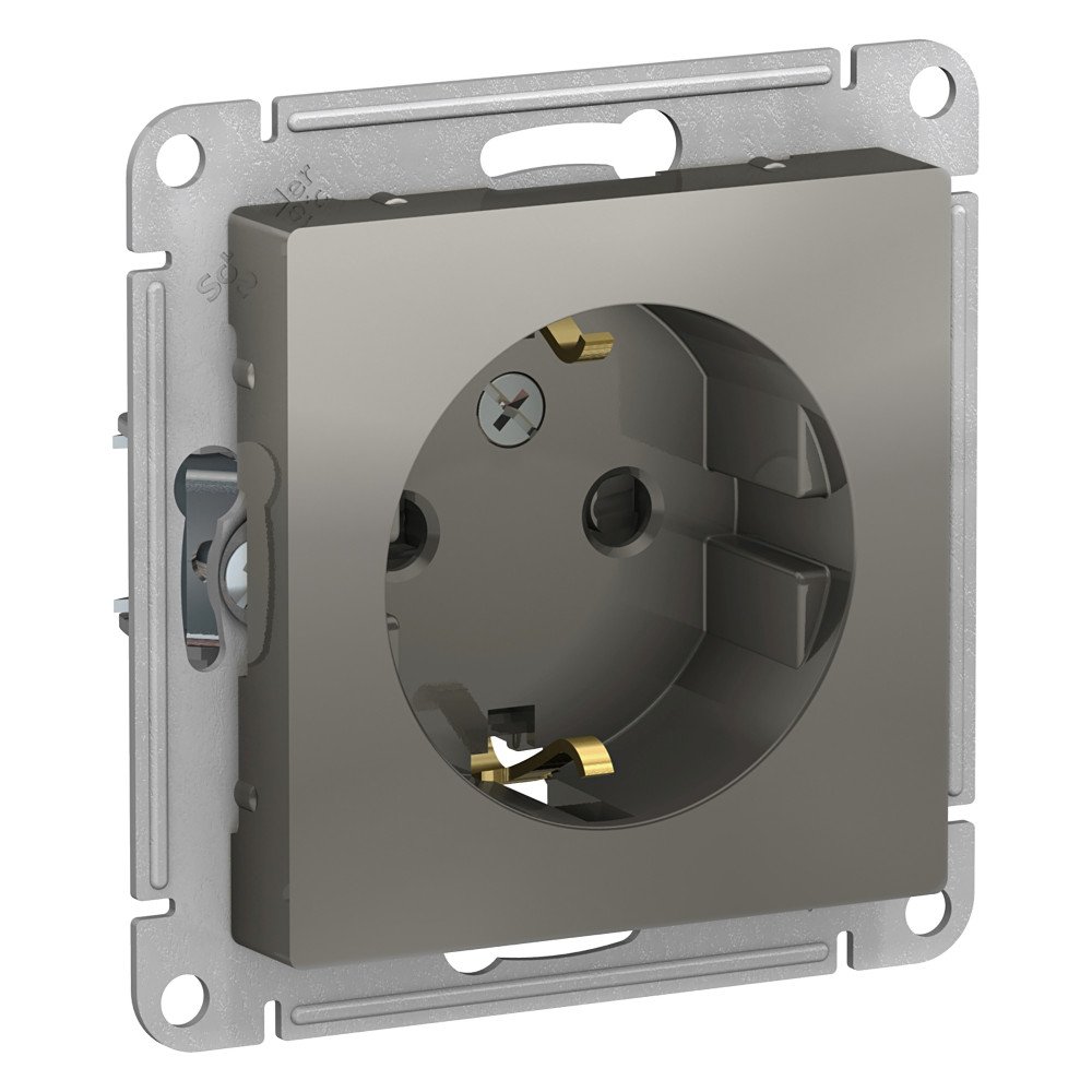 Механизм Systeme Electric (ранее Schneider Electric) серии AtlasDesign в цвете сталь розетки одинарной с заземлением и шторками подходит для сетей 250 В, на ток 16 А.