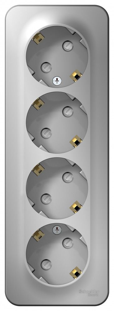 Розетка Systeme Electric (ранее Schneider Electric) BLANCA (алюминий, открытой установки) четырехместная, с заземлением, шторками и изолирующей пластиной предназначена для сетей до 250В, на ток до 16А. Четырехместная розетка позволяет подключить четыре устройства в одном месте. Шторки и заземление обеспечивают дополнительную безопасность при косвенном прикосновении.