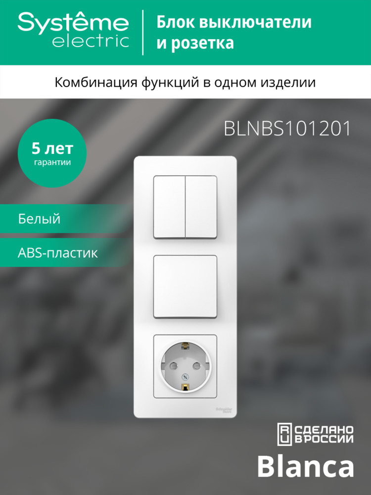 Блок Systeme Electric (ранее Schneider Electric) BLANCA (белый, скрытой установки) предназначен для сетей до 250В, состоит из розетки на 16А с заземлением и шторками, одноклавишного и двухклавишного выключателей на 10А. Двухклавишный выключатель позволяет управлять двумя источниками света из одной точки. Блок удобен в применении и отлично подходит для коридора.