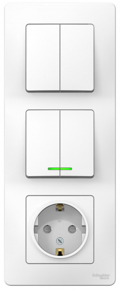 Блок Systeme Electric (ранее Schneider Electric) BLANCA (белый, скрытой установки) предназначен для сетей до 250В, состоит из розетки на 16А с заземлением и шторками и двух двухклавишных выключателей на 10А, один из которых с подсветкой, что делает его легко находимым в отсутствие освещения. Блок удобен в применении и отлично подходит для коридора.