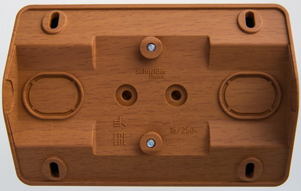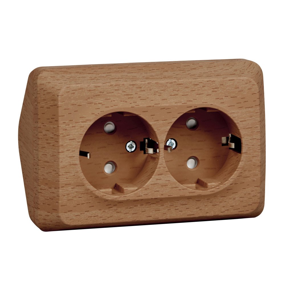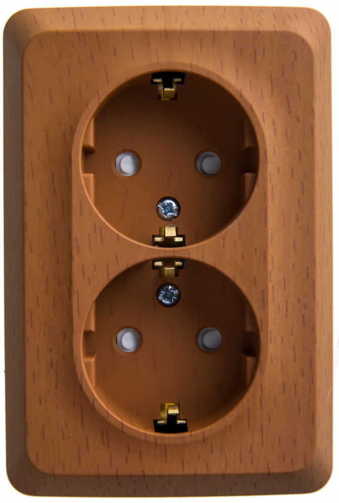 Розетка Systeme Electric (ранее Schneider Electric) ЭТЮД (бук, открытой установки) двухместная угловая с заземлением, без шторок предназначена для применения в сетях до 250В, на ток до 16А. Ее конструкция позволяет установить розетку в угол помещения. Шторки и заземление обеспечивают дополнительную безопасность при косвенных прикосновениях. Изделия цвета Бук обладают уникальным рисунком, напоминающим древесный сруб. Сделано в России.