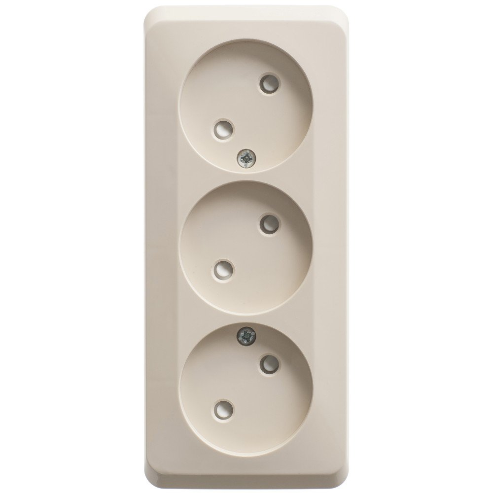Розетка Systeme Electric (ранее Schneider Electric) ЭТЮД (кремовый, открытой установки) трёхместная со шторками, без заземления предназначена для применения в сетях до 250В, на ток до 16А. Трёхместная розетка позволяет подключить три устройства в одном месте. Шторки обеспечивают дополнительную безопасность в доме, где находятся дети. Сделано в России.