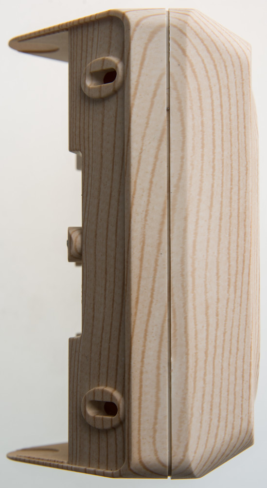 Розетка Systeme Electric (ранее Schneider Electric) ЭТЮД (сосна, открытой установки) двухместная угловая с заземлением, без шторок предназначена для применения в сетях до 250В, на ток до 16А. Ее конструкция позволяет установить розетку в угол помещения. Шторки и заземление обеспечивают дополнительную безопасность при косвенных прикосновениях. Изделия цвета Сосна обладают уникальным рисунком, напоминающим древесный сруб. Сделано в России.