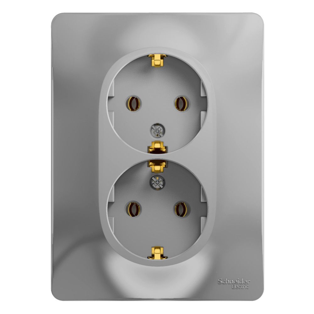 Розетка двойная Systeme Electric (ранее Schneider Electric) серии Glossa (в сборе, цвет алюминий) с заземлением, без шторок подходит для сетей 250 В, на ток 16 А.