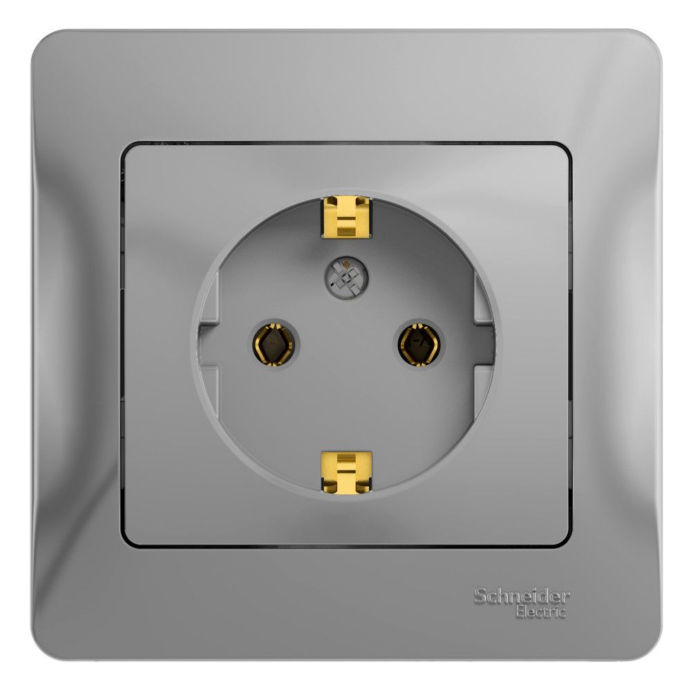 Розетка Systeme Electric (ранее Schneider Electric) серии Glossa (в сборе, цвет алюминий) одинарная без заземления и без шторок подходит для сетей 250 В, на ток 16 А.