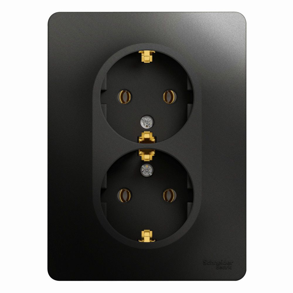 Розетка двойная Systeme Electric (ранее Schneider Electric) серии Glossa (в сборе, цвет антрацит) с заземлением, без шторок подходит для сетей 250 В, на ток 16 А.