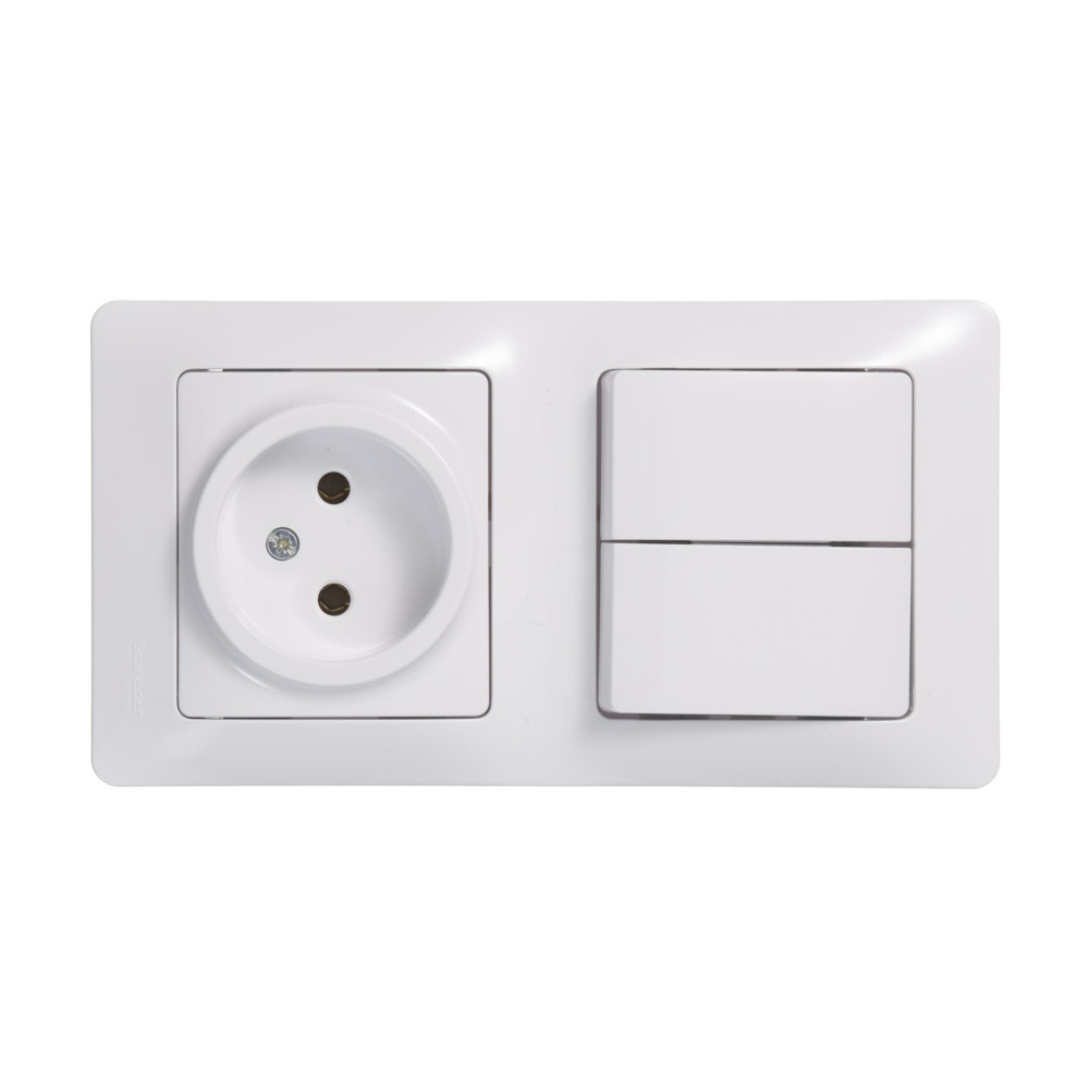 Блок комбинированный Systeme Electric (ранее Schneider Electric) серии Glossa (в сборе, цвет белый) предназначен для сетей до 250 В, состоит из розетки на 16 А и 2-клавишного выключателя на 10 А.