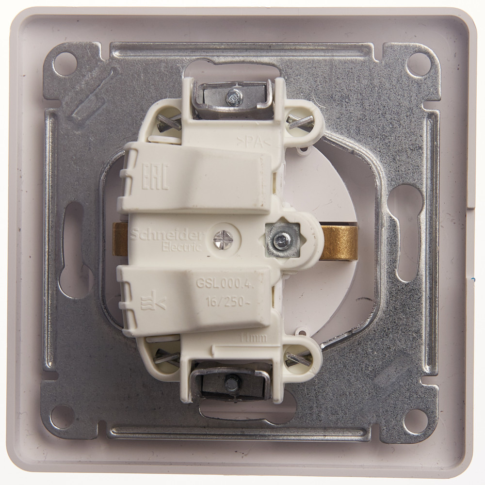 Розетка Systeme Electric (ранее Schneider Electric) серии Glossa (в сборе, цвет белый) одинарная с заземлением, шторками и крышкой подходит для сетей 250 В, на ток 16 А.