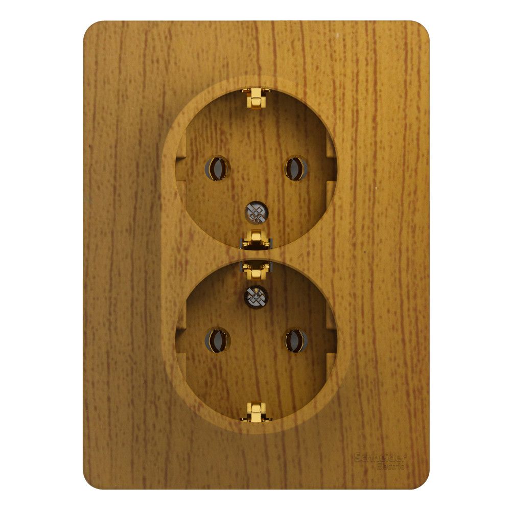 Розетка двойная Systeme Electric (ранее Schneider Electric) серии Glossa (в сборе, цвет дерево дуб) с заземлением, без шторок подходит для сетей 250 В, на ток 16 А.