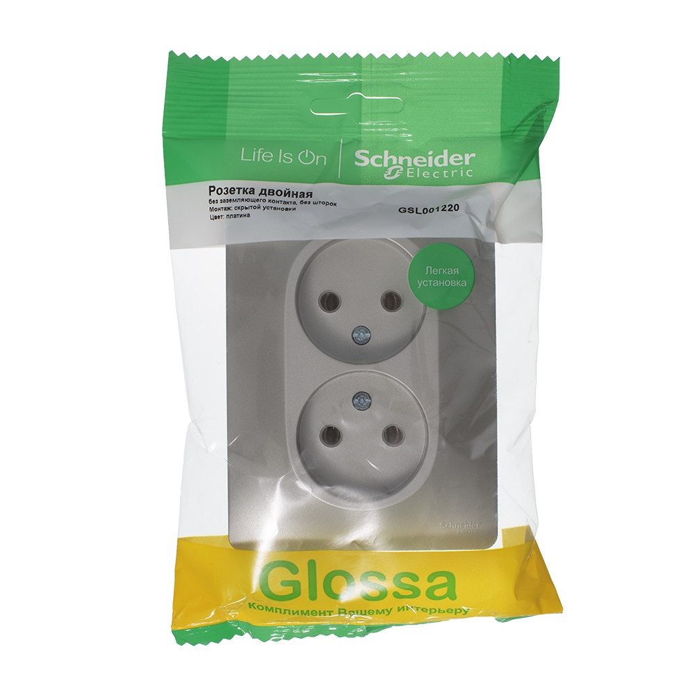 Розетка двойная Systeme Electric (ранее Schneider Electric) серии Glossa (в сборе, цвет платина) без заземления и без шторок подходит для сетей 250 В, на ток 16 А.