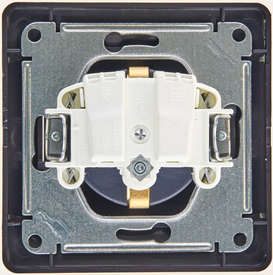 Розетка Schneider Electric Glossa (в сборе, цвет шоколад) одинарная без заземления и без шторок подходит для сетей 250 В, на ток 16 А.