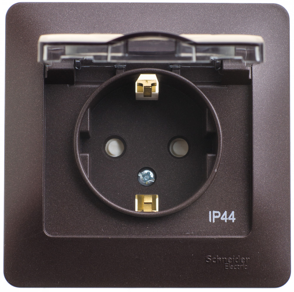 Розетка Schneider Electric Glossa (в сборе, цвет шоколад) одинарная с заземлением, шторками и крышкой подходит для сетей 250 В, на ток 16 А.