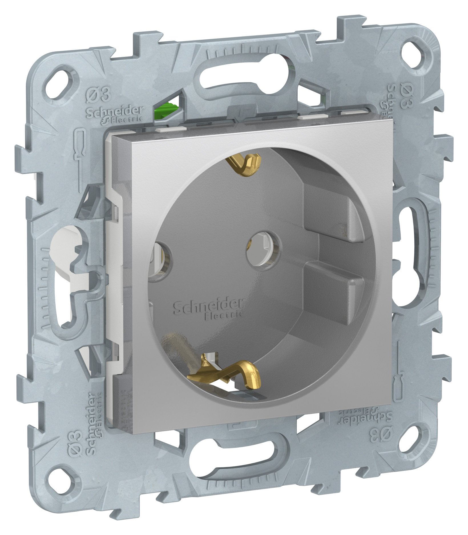Розетка Schneider Electric UNICA NEW (алюминий) с заземлением, без шторок, с быстрозажимными клеммами предназначена для сетей до 250 В на ток до 16 А.