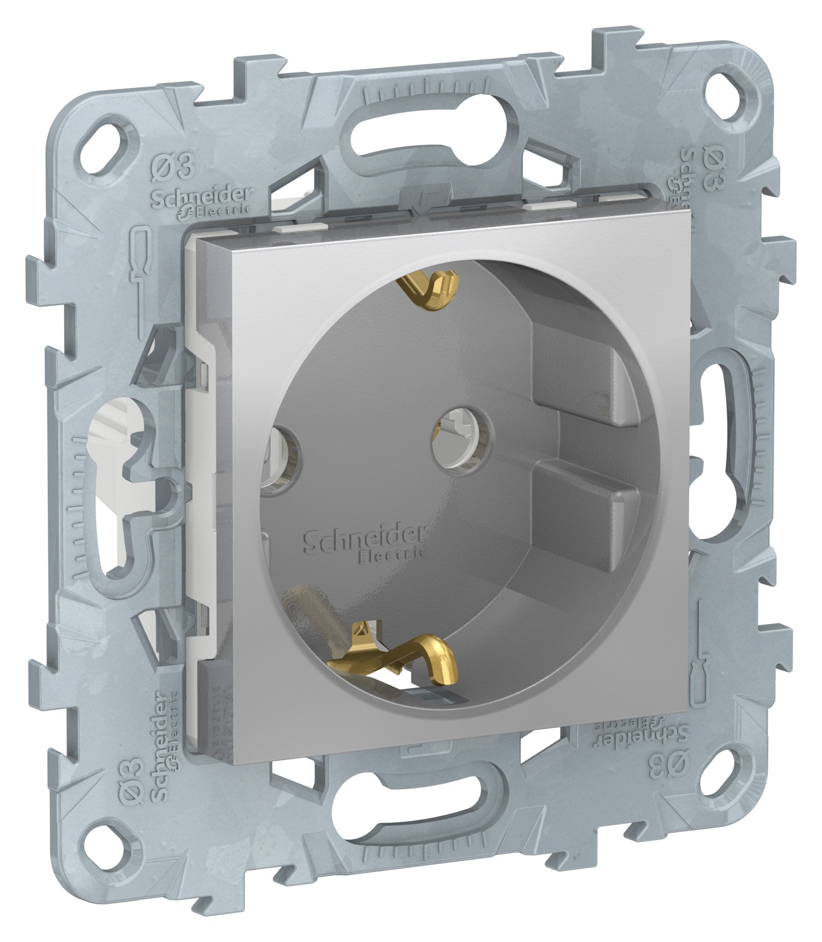 Розетка Schneider Electric UNICA NEW (алюминий) с заземлением, без шторок, с винтовыми зажимами предназначена для сетей до 250 В на ток до 16 А.