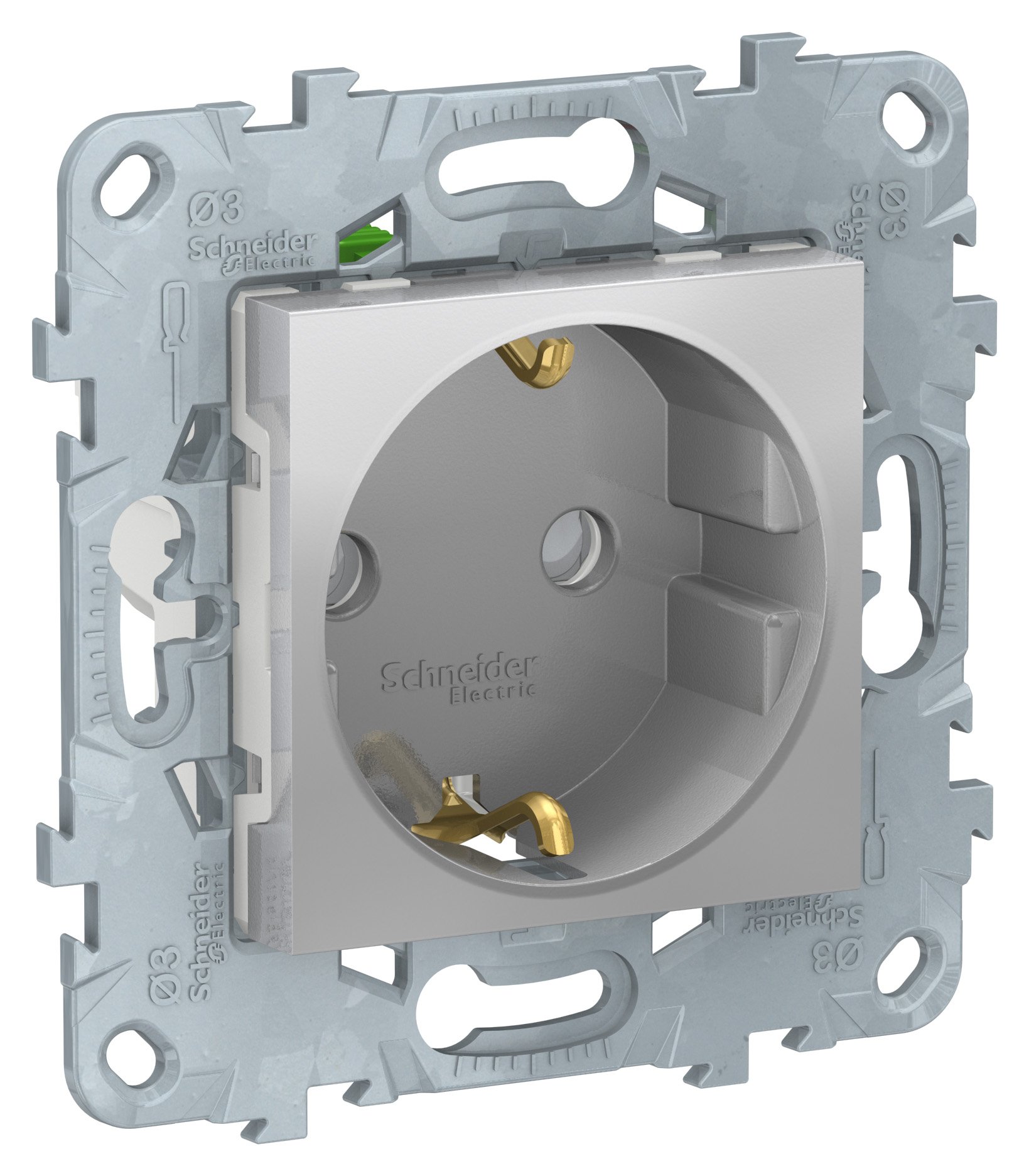 Розетка Schneider Electric UNICA NEW (алюминий) с заземлением, со шторками, с быстрозажимными клеммами предназначена для сетей до 250 В на ток до 16 А.