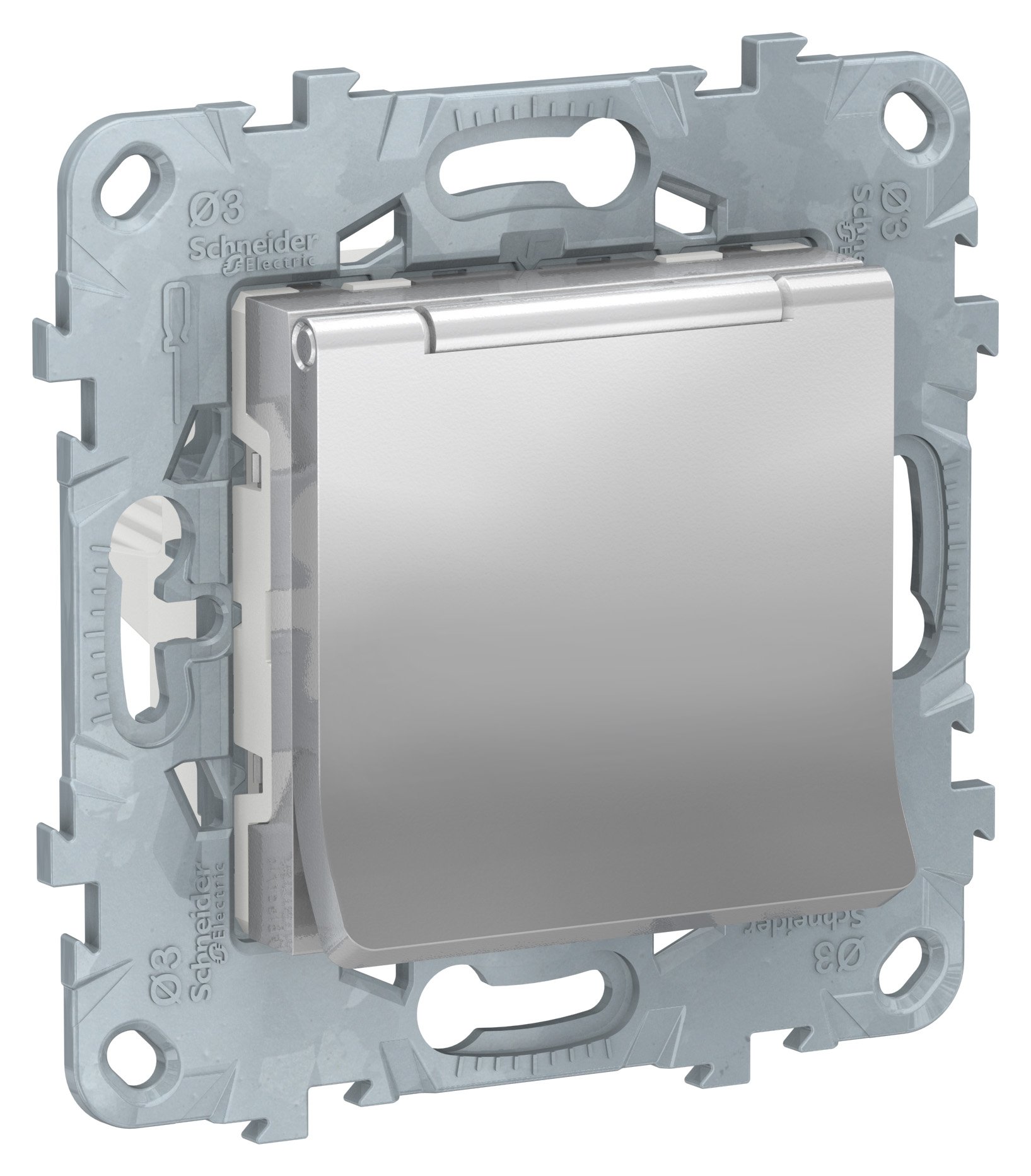 Розетка Schneider Electric UNICA NEW (алюминий) с заземлением, со шторками, с крышкой предназначена для сетей до 250 В на ток до 16 А.