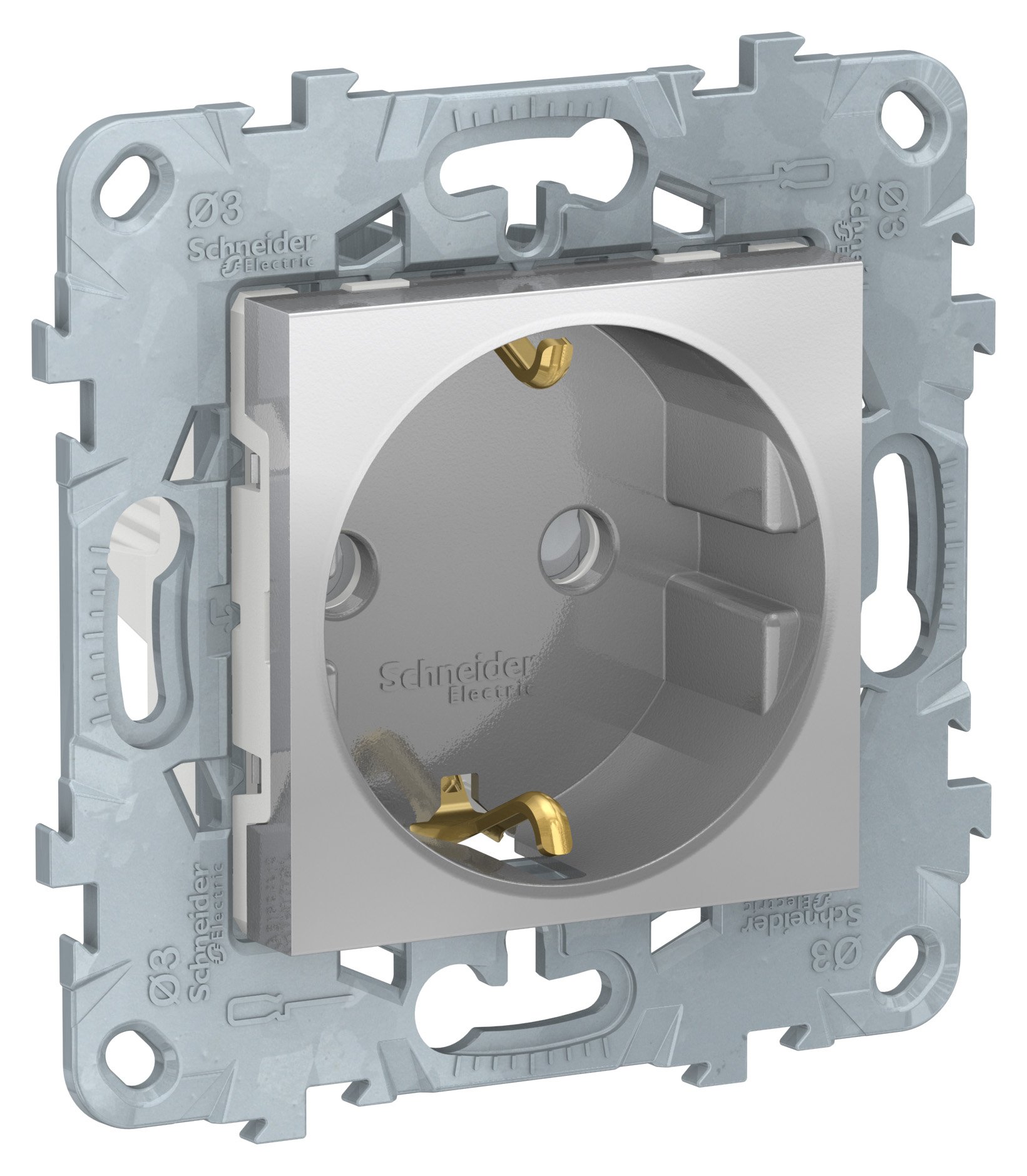 Розетка Schneider Electric UNICA NEW (алюминий) с заземлением, со шторками, с винтовыми зажимами предназначена для сетей до 250 В на ток до 16 А.