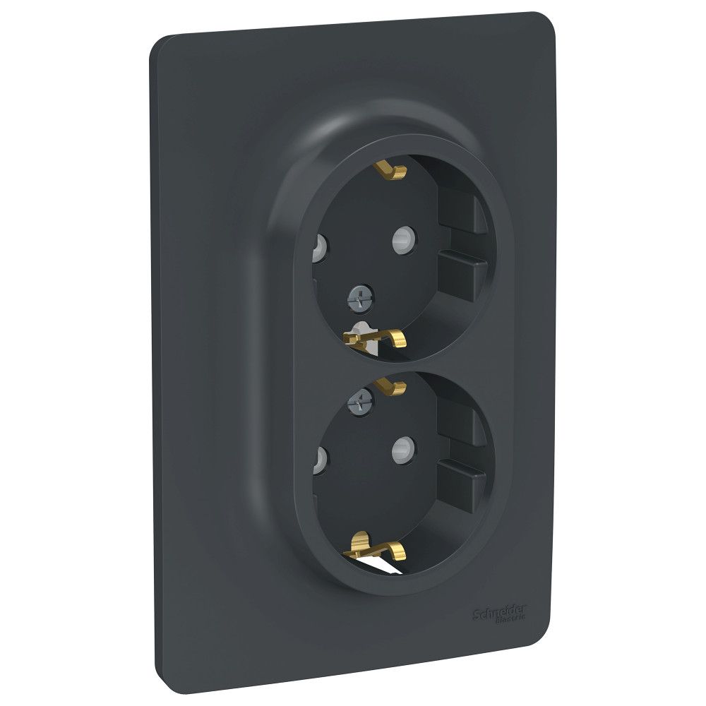 Розетка Schneider Electric UNICA NEW (антрацит) двойная с заземлением, со шторками, с винтовыми зажимами предназначена для сетей до 250 В на ток до 16 А.