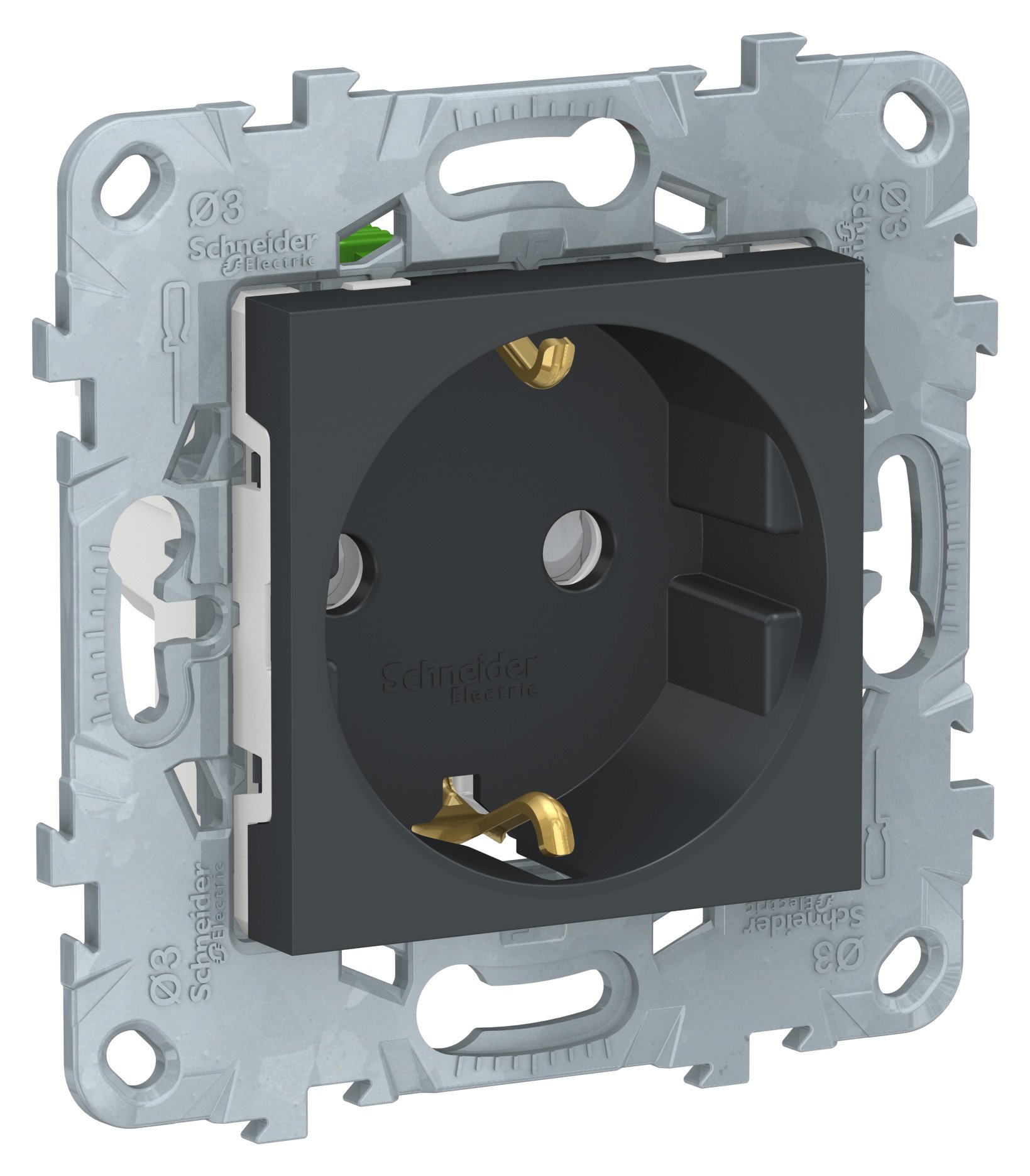 Розетка Schneider Electric UNICA NEW (антрацит) с заземлением, со шторками, с быстрозажимными клеммами предназначена для сетей до 250 В на ток до 16 А.