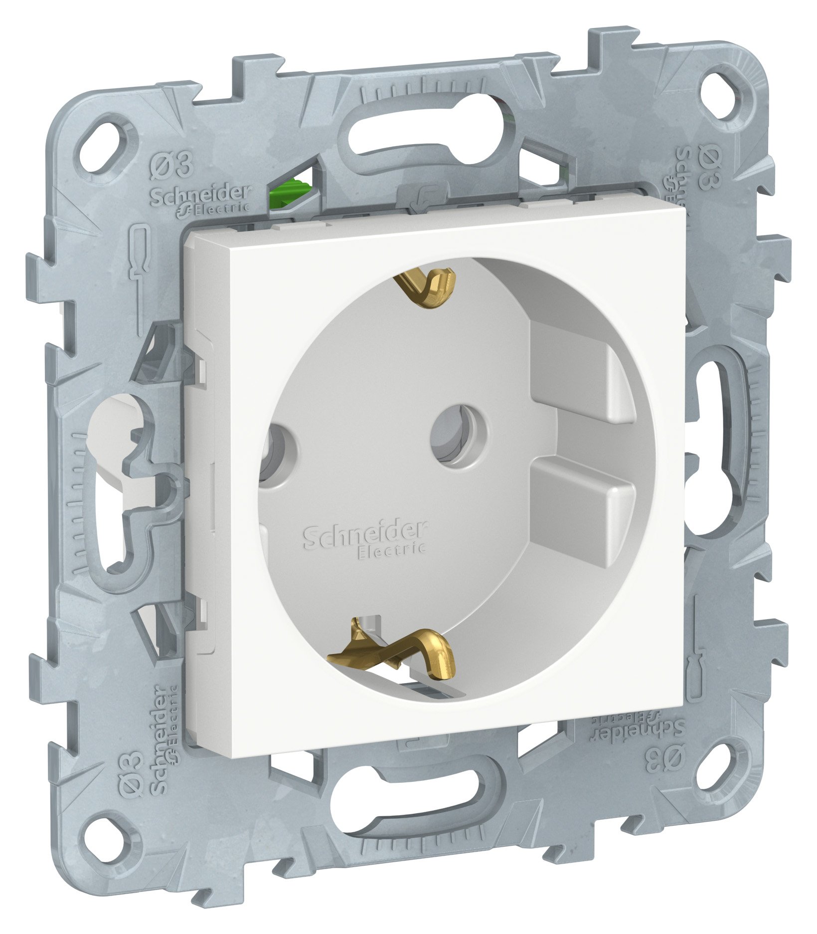 Розетка Schneider Electric UNICA NEW (белый) с заземлением, со шторками, с быстрозажимными клеммами предназначена для сетей до 250 В на ток до 16 А.