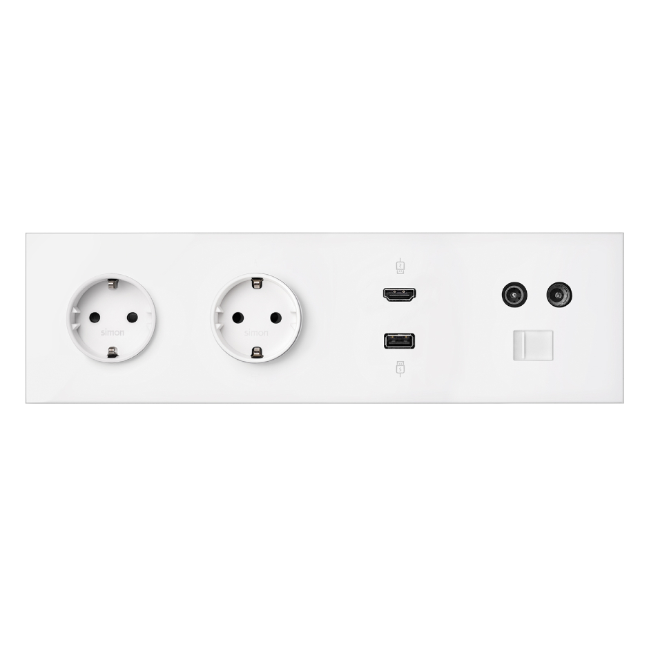 Simon 100 Белый матовый Кит 4 поста, фронт. Накладка на 2 розетки Schuko + 1 розетку TV+SAT + 1 розетку RJ45 + 1 розетку HDMI + 1 розетку USB от производителя Simon. Артикул производителя 10020402-230.