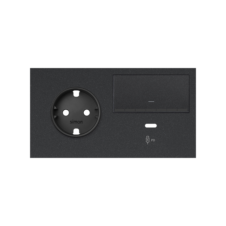 —Simon 100 Черный матовый Кит 2 поста, фронт. Накладка на 1 роз.Schuko (прв) + 1 з/у USB C + 1 клав.светорег-ра, арт 10020256-238