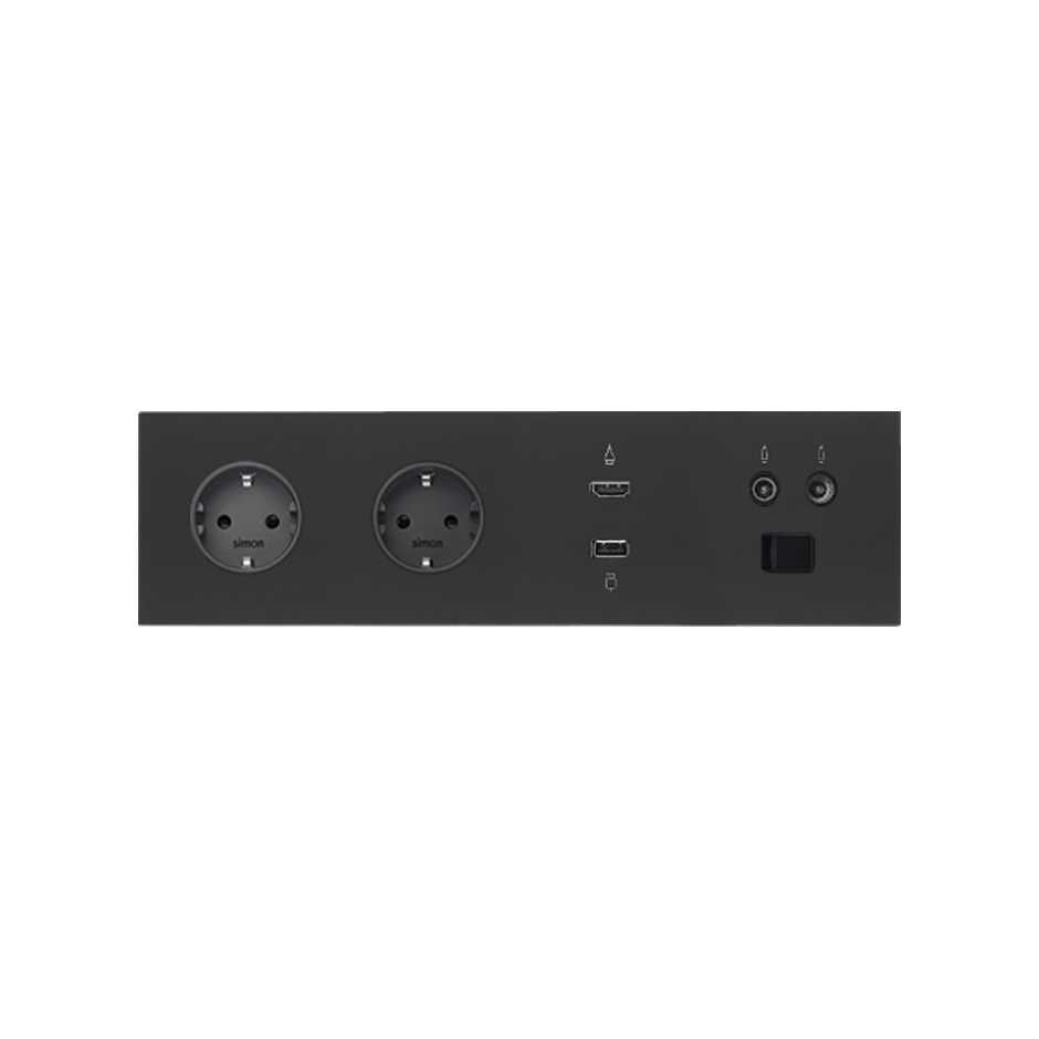 Simon 100 Черный матовый Кит 4 поста, фронт. Накладка на 2 розетки Schuko + 1 розетку TV+SAT + 1 розетку RJ45 + 1 розетку HDMI + 1 розетку USB от производителя Simon. Артикул производителя 10020402-238.