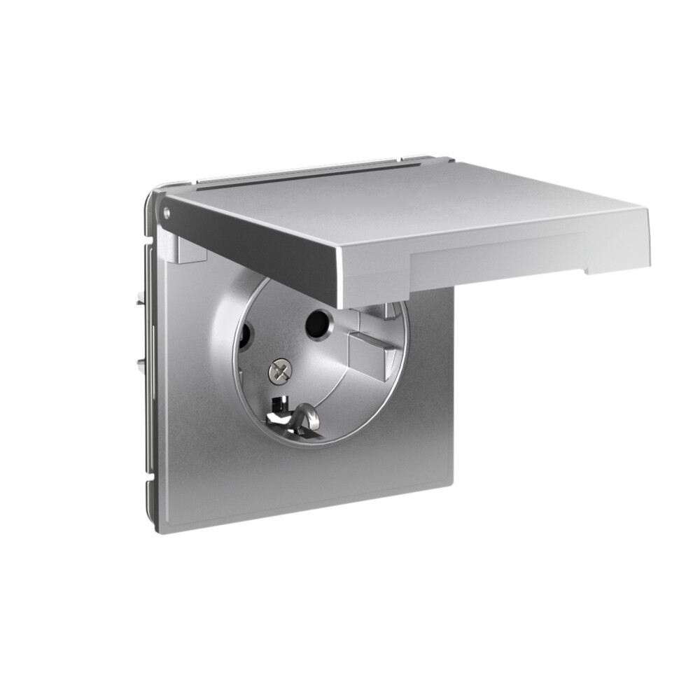 Механизм Systeme Electric серии ArtGallery в цвете алюминий розетки одинарной с заземлением, шторками и крышкой подходит для сетей 250 В, на ток 16 А.