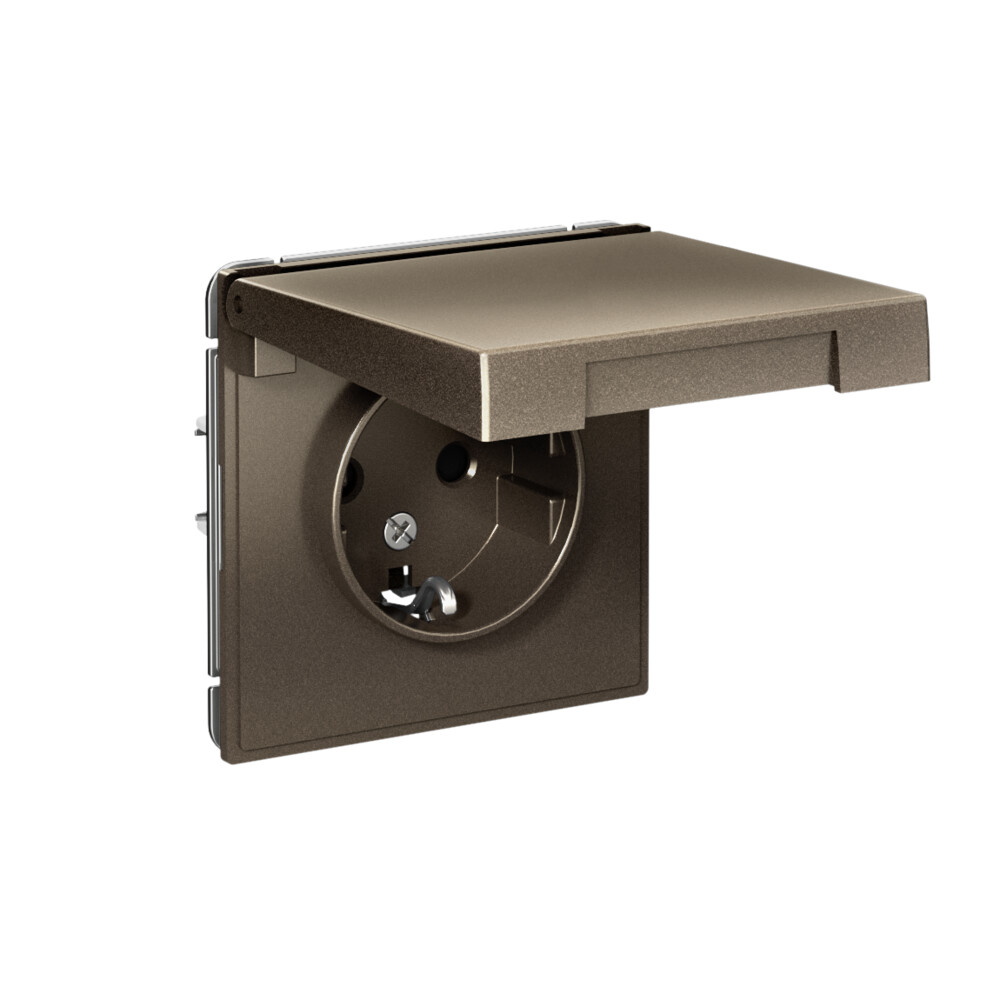 Механизм Systeme Electric серии ArtGallery в цвете мокко розетки одинарной с заземлением, шторками и крышкой подходит для сетей 250 В, на ток 16 А.