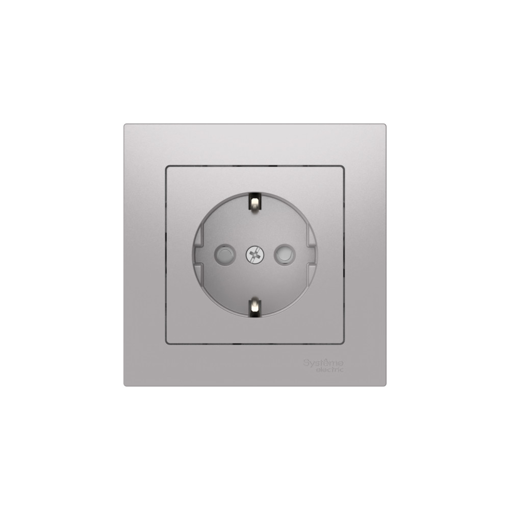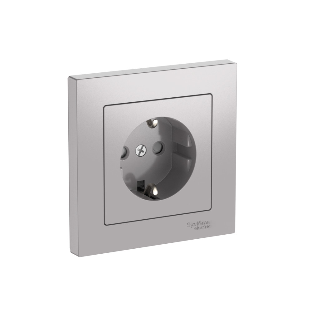 Механизм с быстрозажимными клеммами Systeme Electric (ранее Schneider Electric) серии AtlasDesign в цвете алюминий розетки одинарной с заземлением и со штороками в сборе подходит для сетей 250 В, на ток 16 А. С помощью новых быстрозажимных клемм монтаж розеток и выключателей стал намного быстрее. Теперь подключение не требует использования отвертки.