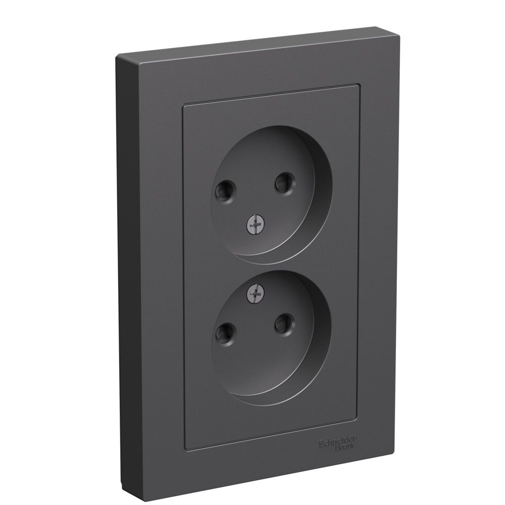 Розетка двойная Systeme Electric (ранее Schneider Electric) серии AtlasDesign (в сборе, цвет БАЗАЛЬТ) без заземления со шторками подходит для сетей 250 В, на ток 16 А.