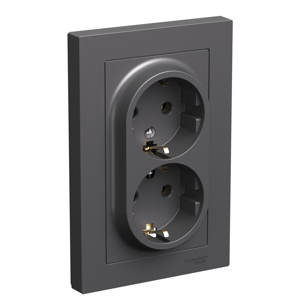 Розетка двойная Systeme Electric (ранее Schneider Electric) серии AtlasDesign (в сборе, цвет БАЗАЛЬТ) с заземлением, без шторок подходит для сетей 250 В, на ток 16 А.