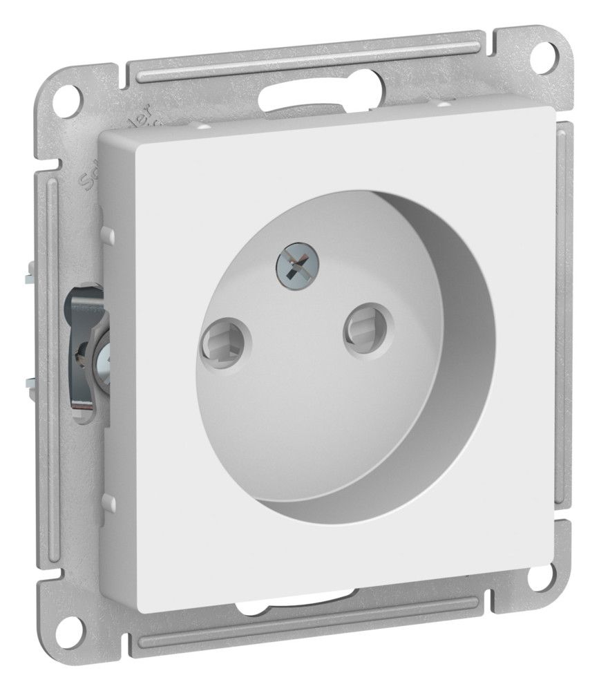 Механизм Systeme Electric (ранее Schneider Electric) серии AtlasDesign в цвете ЛОТОС розетки одинарной без заземления со шторками подходит для сетей 250 В, на ток 16 А.
