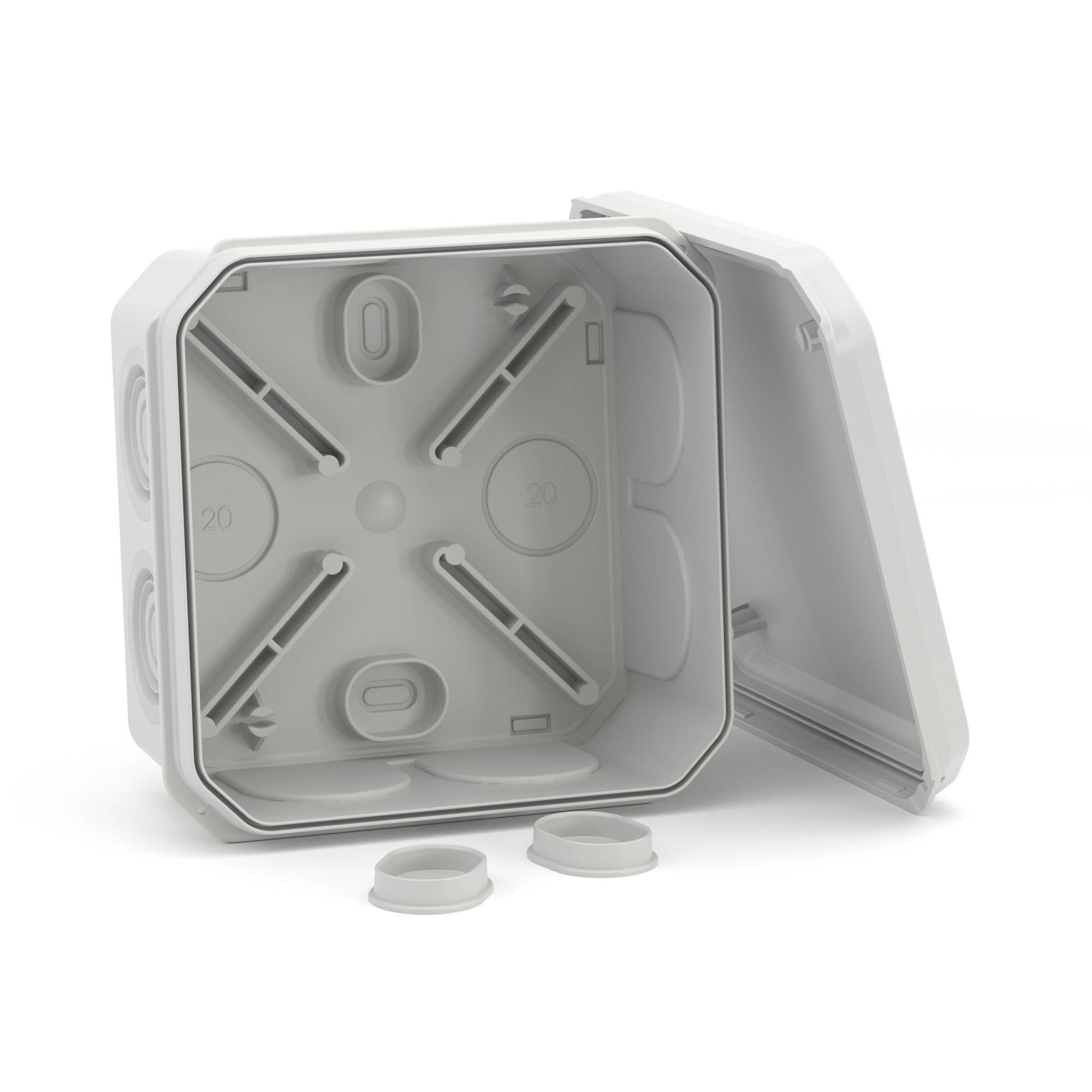 Применяется для защиты и эстетичного оформления мест соединения кабелей (информационных, осветительных, силовых). Коробка имеет 8 герметичных вводов по периметру для ввода жестких и гофрированных труб, а также кабелей с максимальным диаметром 20 мм, и 2 дополнительных ввода на торцевой части коробки для ввода жестких и гофрированных труб, а также кабелей диаметром 20 мм. Параметры 85x85х40 мм (внутренние размеры) и 94х94х48 мм (внешние размеры). Квадратная форма. Материал пластик. Крышка - матовая, непрозрачная, закрывается защелкиванием. IP55 по ГОСТ 14254. Можно устанавливать как в помещении, так и на открытом воздухе (при условии защиты от воздействия прямых солнечных лучей и осадков). Цвет - серый. Температура эксплуатации от 25 до +60 С. Halogen free.