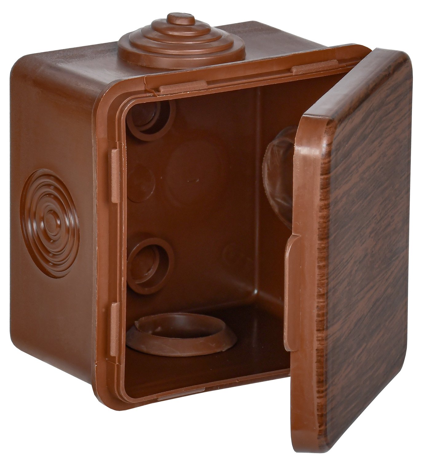 Монтажные коробки для открытого монтажа под структуру дерева предназначены для разветвления проводов и кабелей, также для скрытия и дополнительной защиты мест коммутации. Коробки для открытого монтажа используются как часть системы решений для деревянного домостроения, состоящей из гофрированных труб, клипс и коробок в цвет дерева.