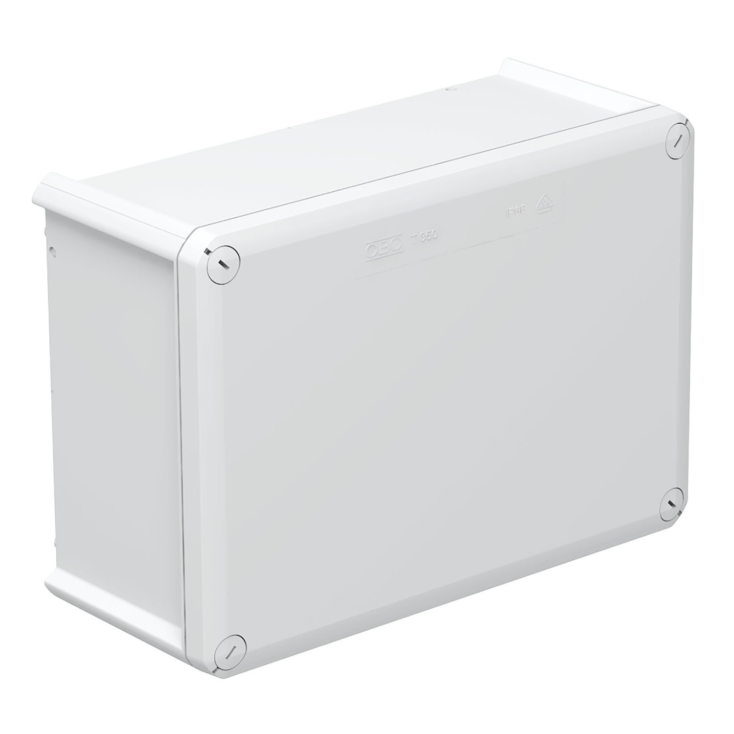 Закрытая кабельная распределительная коробка для соединения кабелей и проводов в помещении и в защищенных зонах вне помещения. Прямоугольная форма без вводов. Подходит для настенного и потолочного монтажа и установки на монтажных листах и для резьбы на дне. С возможностью для внутреннего закрепления и монтажом поверх угловых колпаков. Крышка с быстроразъемным соединением может быть опломбирована. Изготовлено из материалов, не содержащих галогены. Кабельная распределительная коробка согласно DIN EN 60670. Огнестойкость согласно DIN EN 60695-2-11, температура испытания 650°C. Ударопрочность IK05 согласно DIN EN 50102.